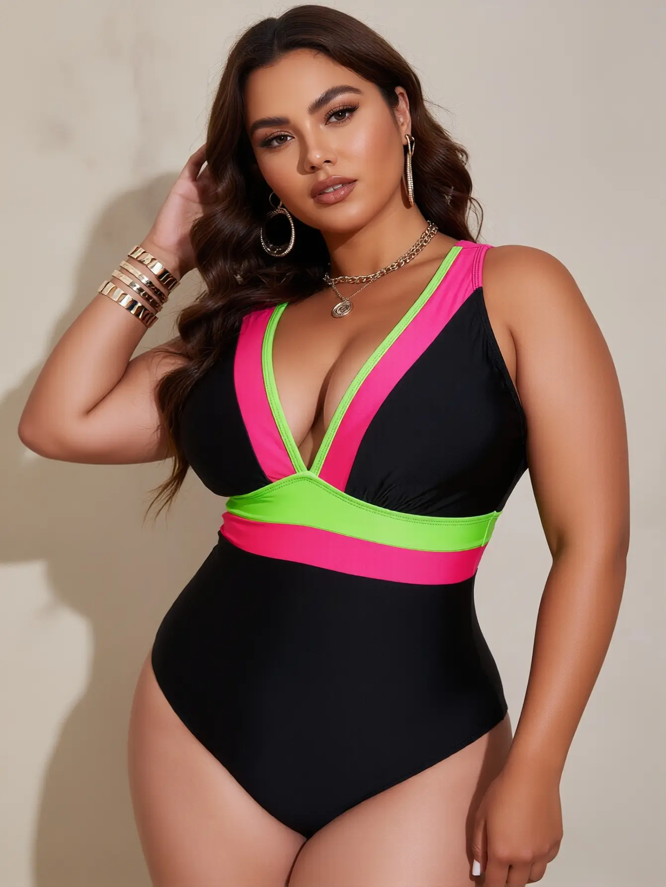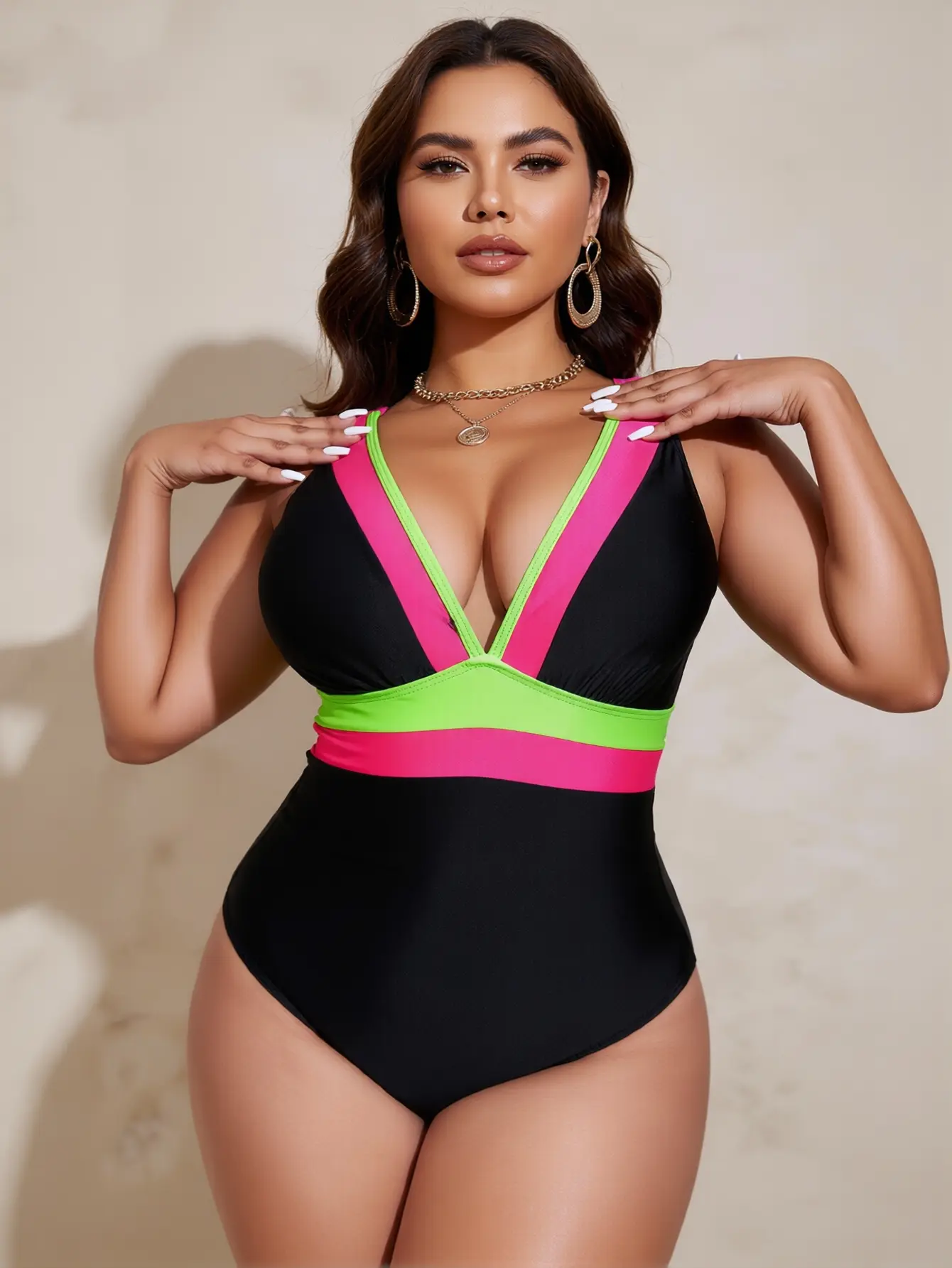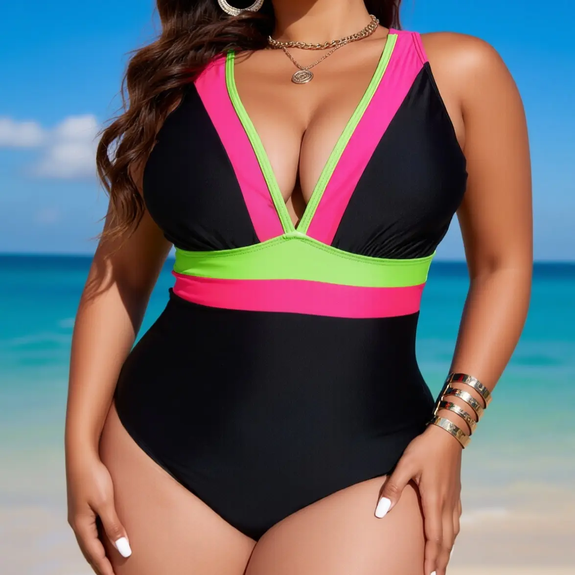 【Black & Neon Color Block】: Drenched in a classic solid black base with striking neon pink and lime green color block accents, this plus-size one-piece swimsuit delivers a visually slimming effect that flatters curvy figures, making it a bold, fashion-forward choice for beach days, pool parties, or tropical getaways.