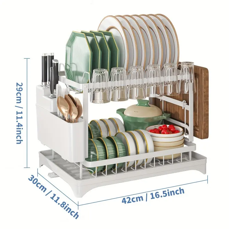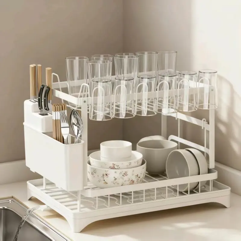 Double drain rack, kitchen countertop dish rack, kitchen accessories with drain tray and cutlery rack