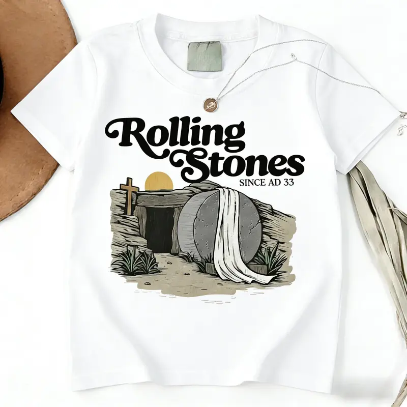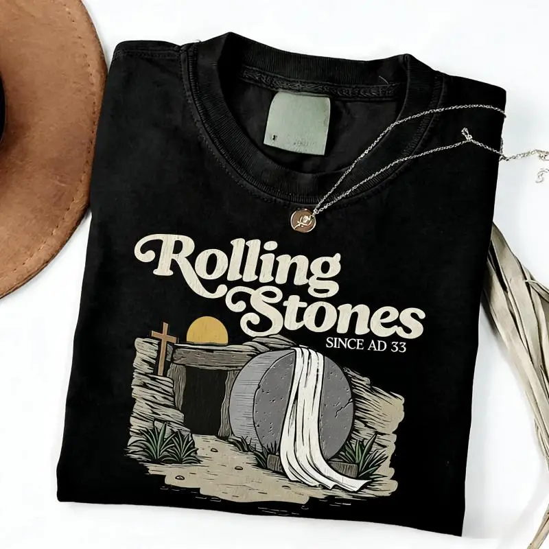 The Christian Graphic T-Shirt features a unique "Rolling Stones Since AD 33" design.It's a religious Easter shirt, perfect for those who appreciate vintage retro Rolling Stones-inspired tees.This faith-based apparel is ideal for casual wear.