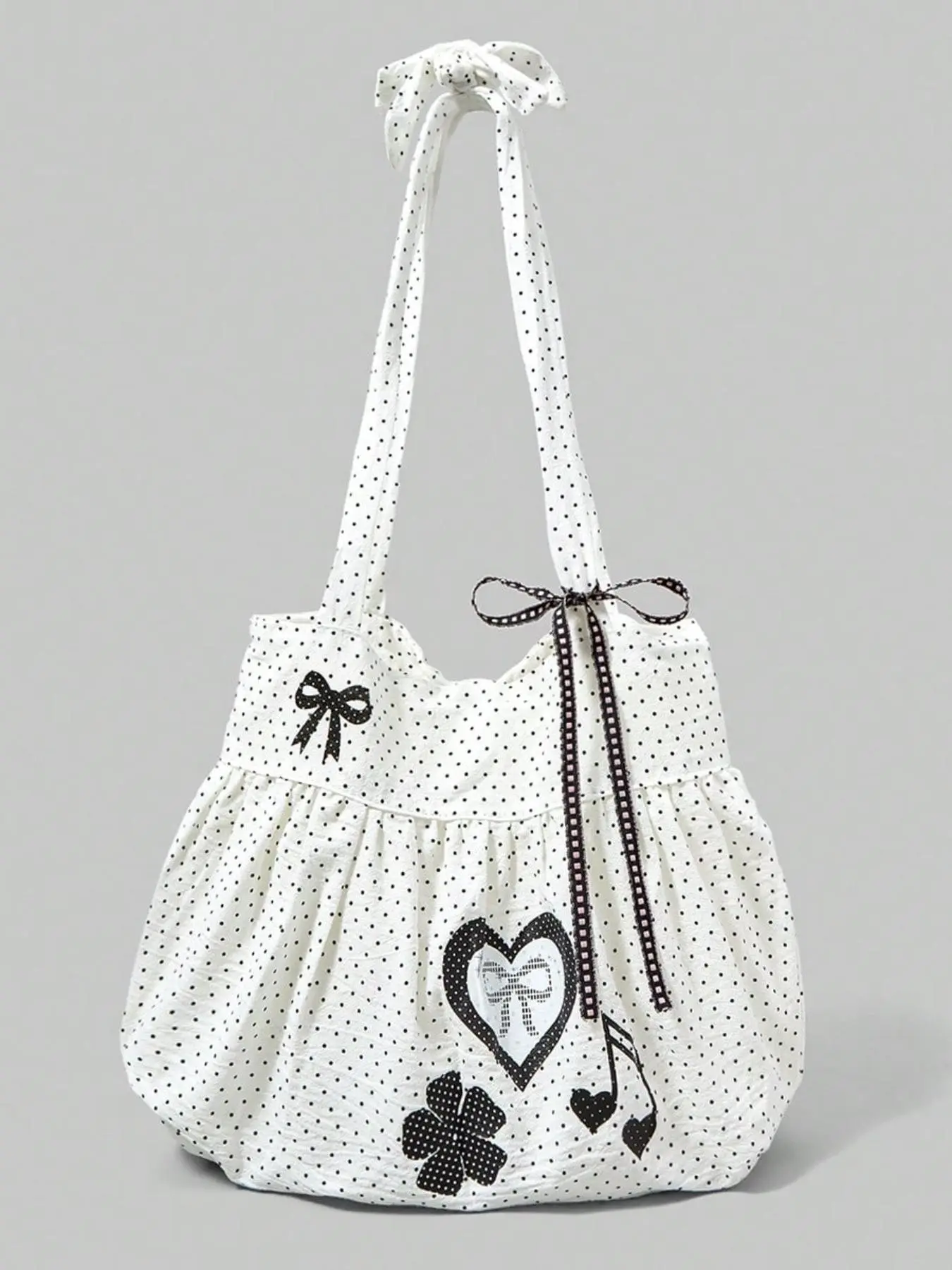 Sweet Cute Bow Vintage Heart Ladies Shoulder Bag, Simple Polka Dot Summer Floral Note Large Capacity Tote, Fits Laptop, Ideal for Daily Commute