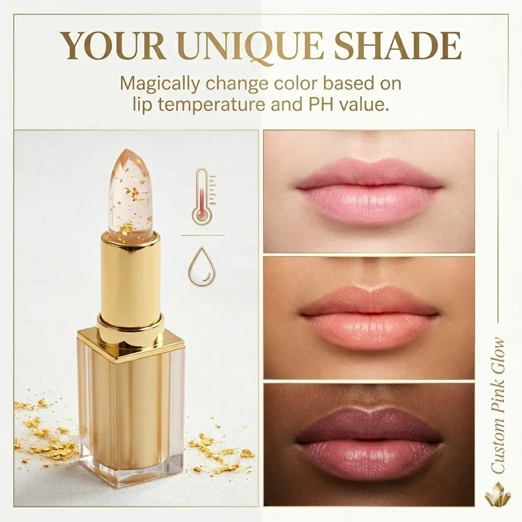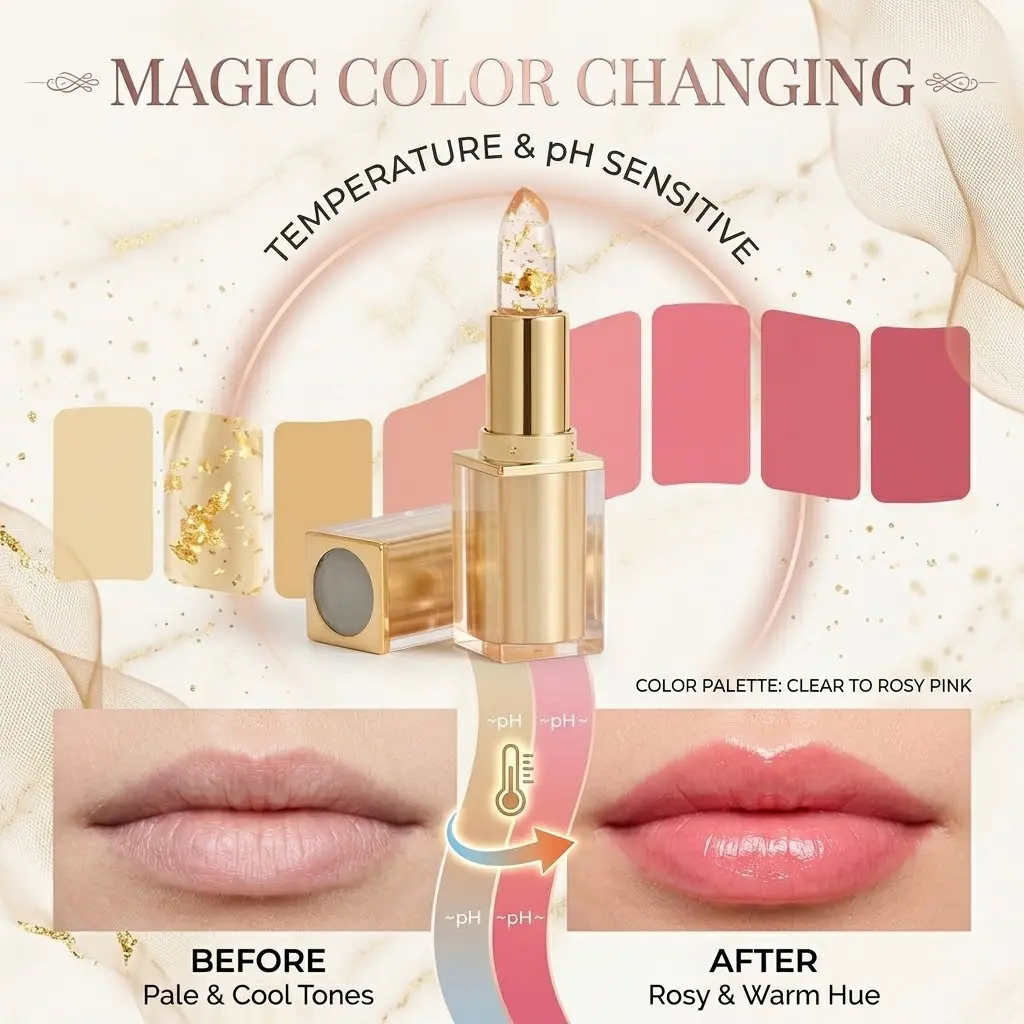 This lipstick combines moisturizing properties, transferproof color changing, and a gold crystal lipgloss. It offers a versatile and stylish look suitable for various occasions.