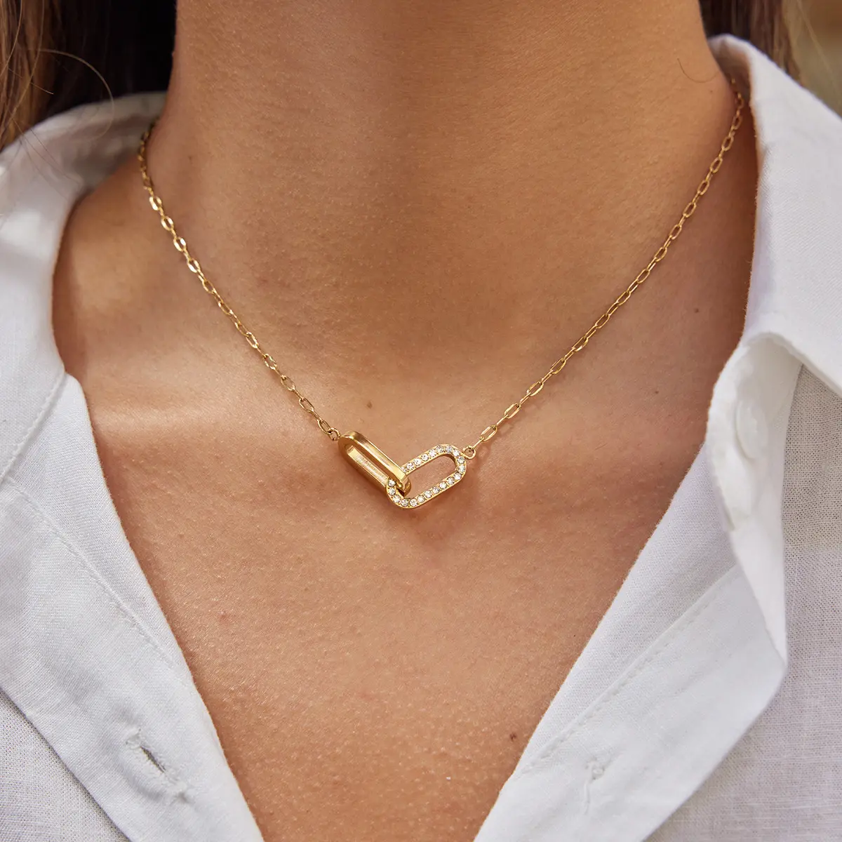 Interlocking Double Ring Geometric Clavicle Necklace 18K Gold Plated Stainless Steel Luxury Style Hot Selling for Cross-border