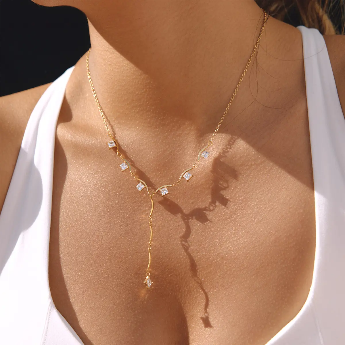 18K Gold Plated Stainless Steel White Square Wave Bar Necklace & Y‑Shaped Necklace, Fashionable and Personalized Jewelry