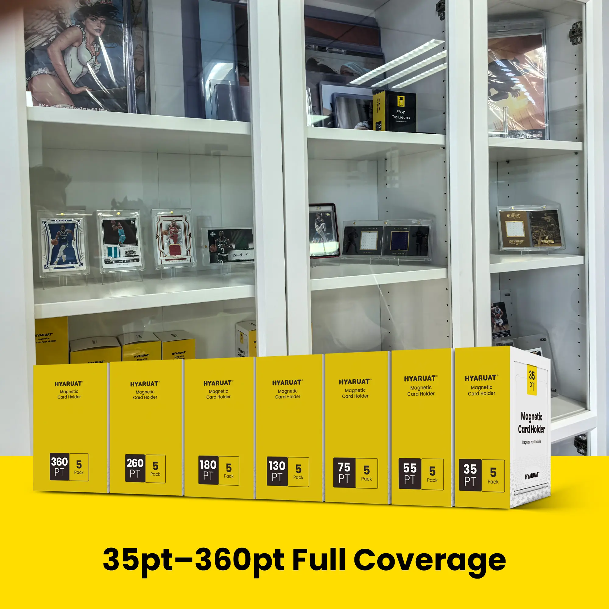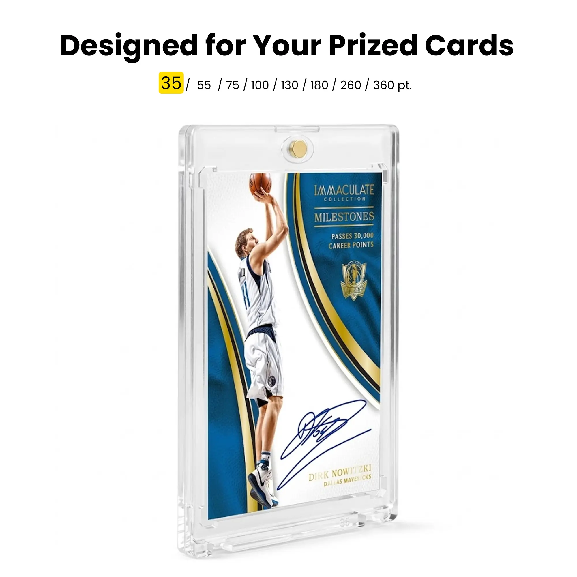 Our magnetic card holders fit standard trading card size (2.5” x 3.5”) and are available in multiple thicknesses (35PT–360PT). Perfect for collectors, these holders safeguard cards of various thicknesses. A must-have for preserving your valuable collection.