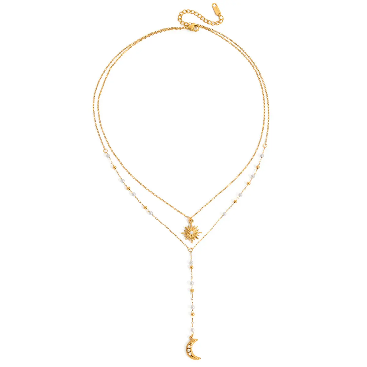 Sun & Moon Pendant Necklace, Double Layer Pearl Choker, Anti-Tarnish