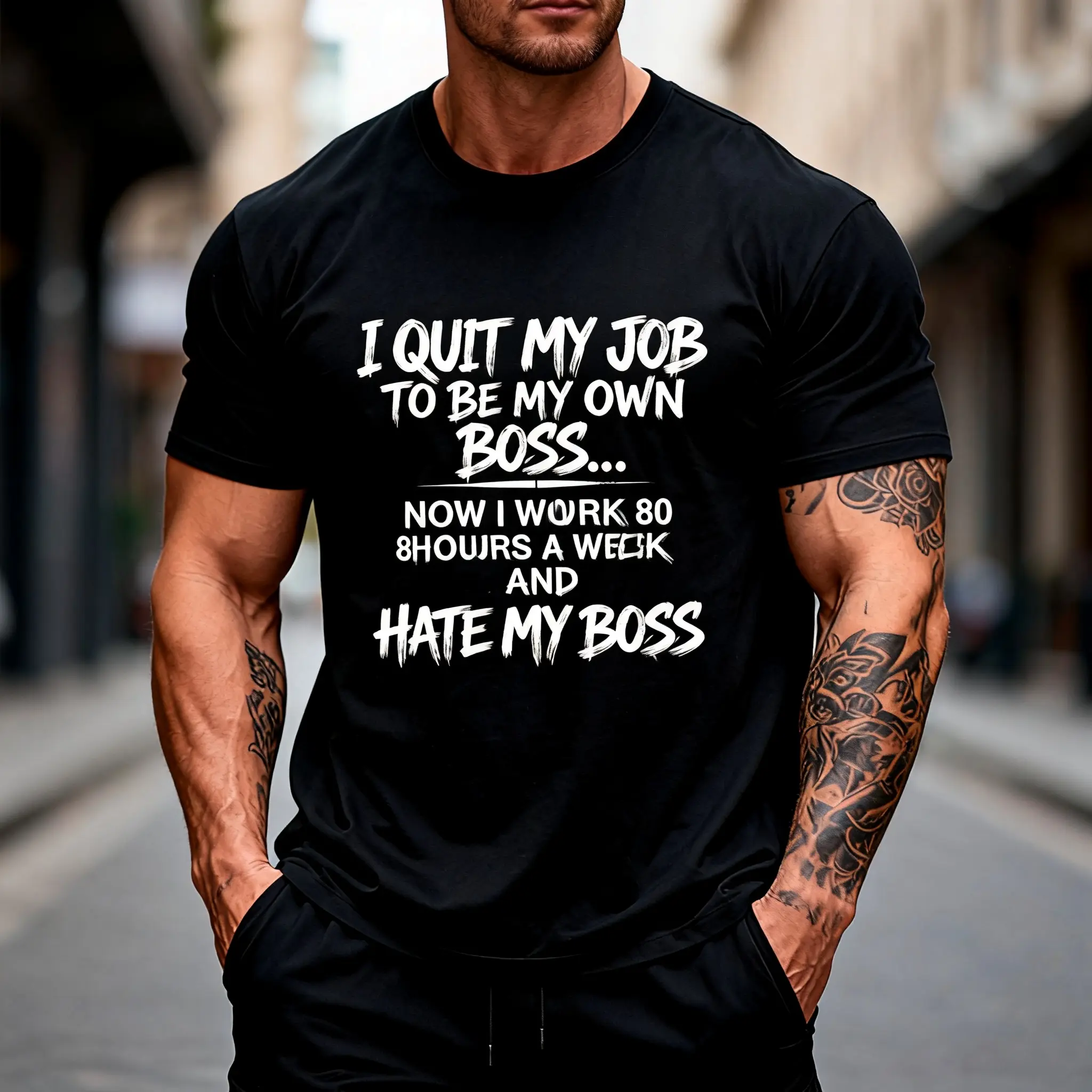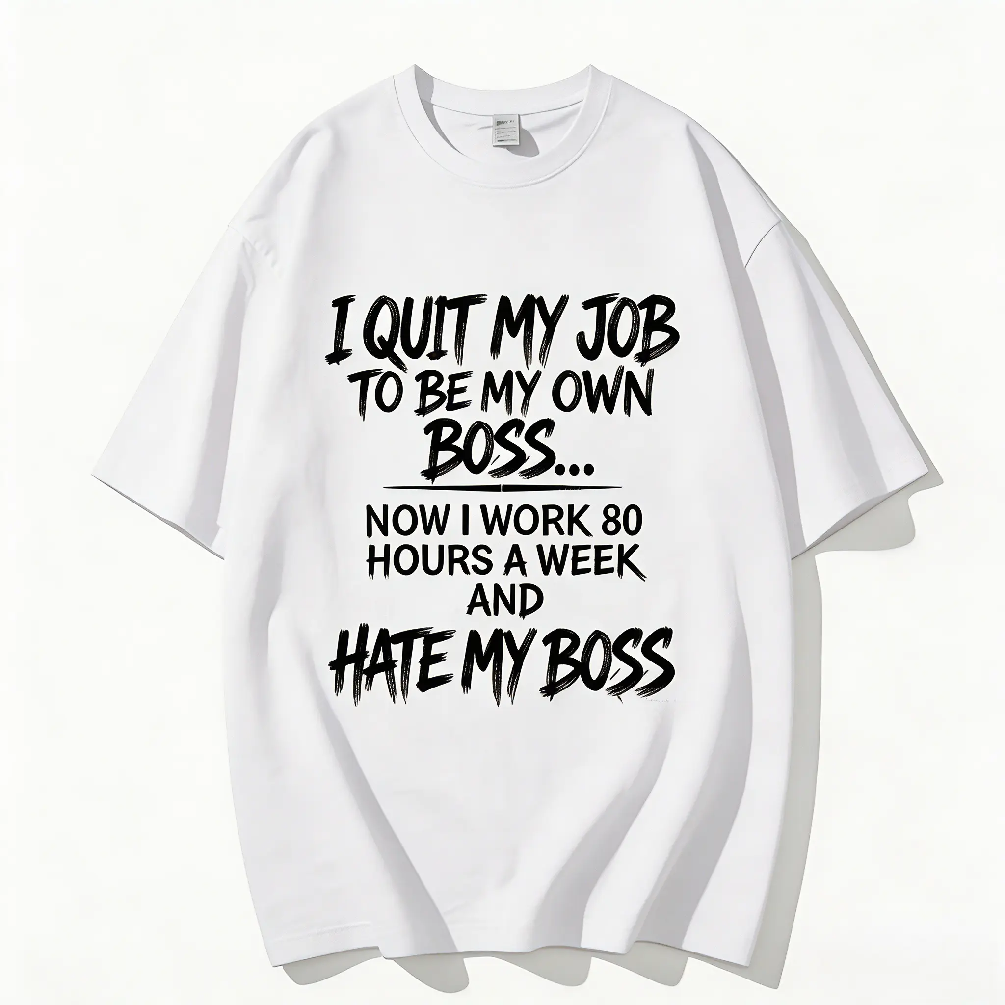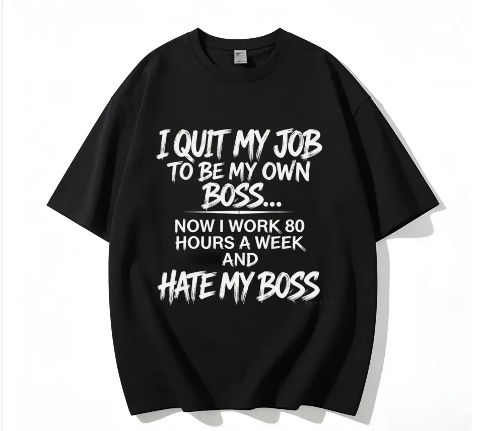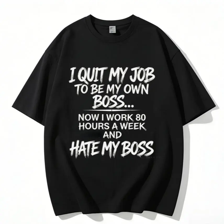 Tired of quitting your 9-to-5 job chasing the “be your own boss” dream, only to end up working 80-hour weeks, answering emails at 2 AM, and resenting the tyrant in the mirror (that’s you)? This hilarious self-employed tee features bold, gritty brush-stroke text in a vintage street style—“I QUIT MY JOB TO BE MY OWN BOSS… NOW I WORK 80 HOURS A WEEK AND HATE MY BOSS”—the ultimate visual punchline for every entrepreneur, SOHO seller, freelancer, and small business owner who’s ever felt the brutal irony of the self-made grind.
