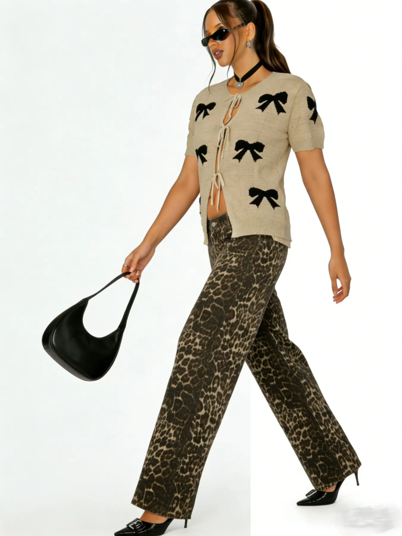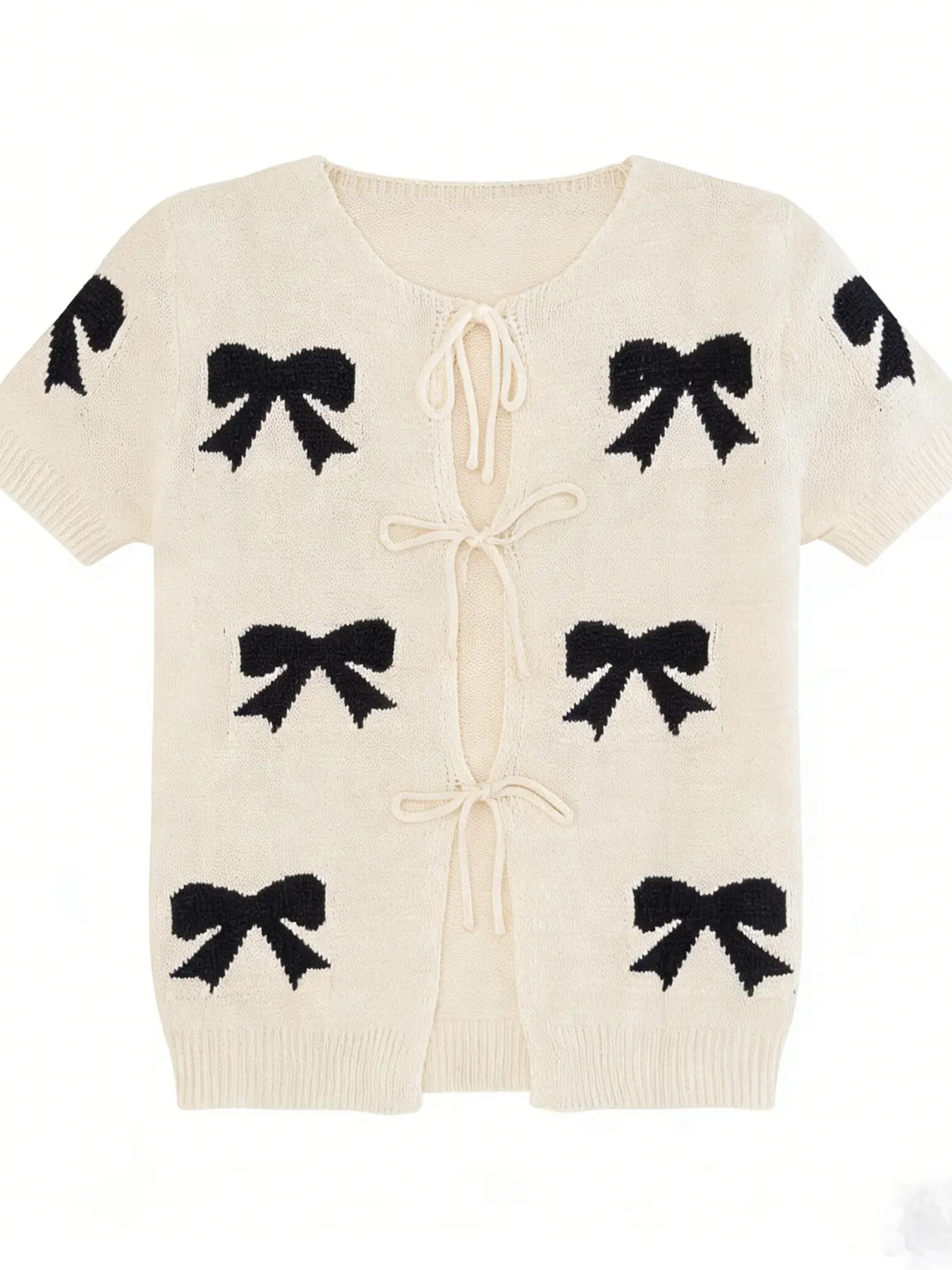 Playful Contrast Beige-black Bow Jacquard Design Tie-front Open Knitwear Cardigan, Casual Soft Neutral Short Sleeve Knits Sweater, 2026 Summer Coastal Vacation Cool Girl Fashion Sexy Tie Top, Coquette Aesthetic Fashion Style, Y2K Retro Vintage Style