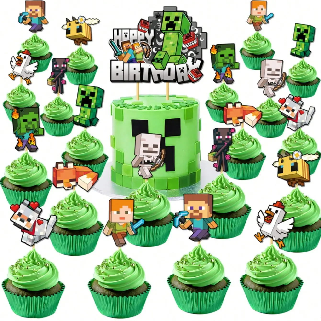 18pcs 26pcs Theme Pixel World Decoration Set, Includes Pull Flags, Plaques, Birthday Party Supplies, Perfect for Christmas Halloween Birthdays