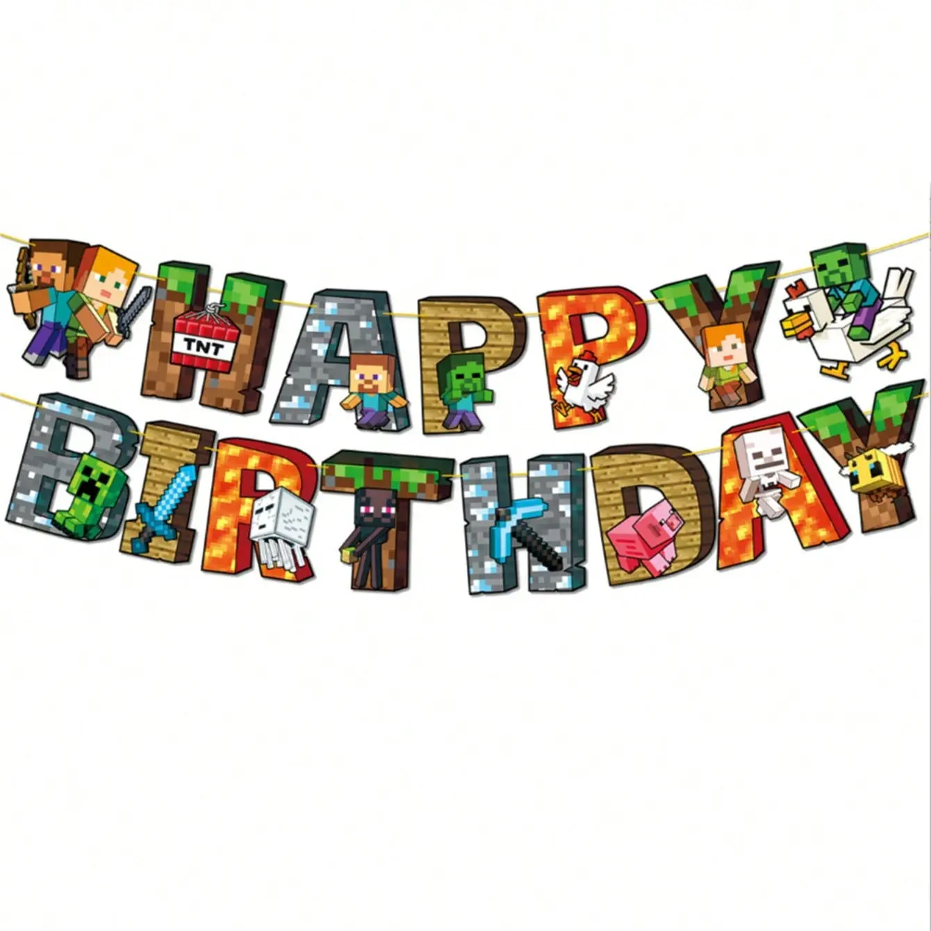 Pixel World Birthday Decoration Set, Party Banner, Background Cloth, Flags, Plates, Napkins, Cups, Perfect for Christmas, Halloween, Birthdays