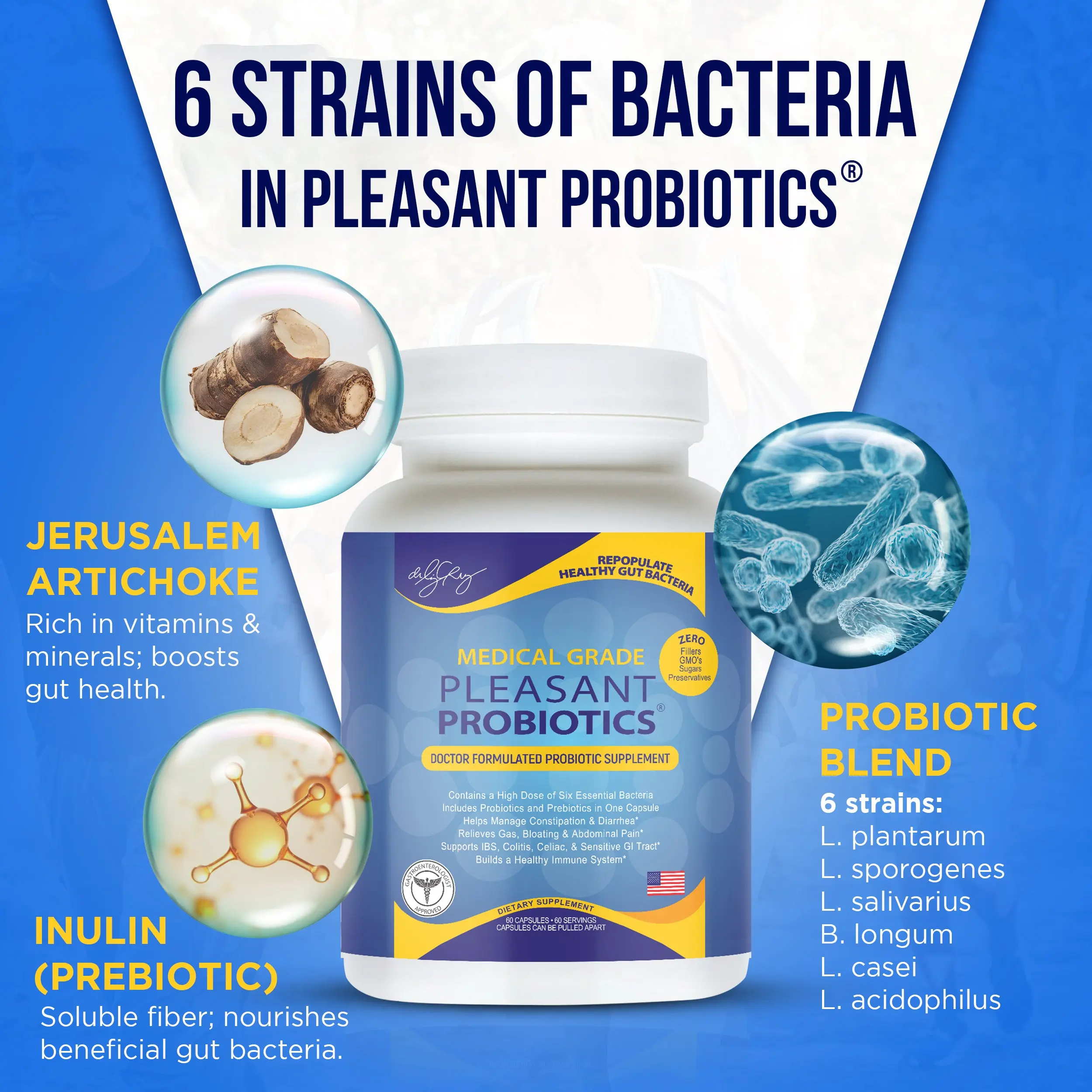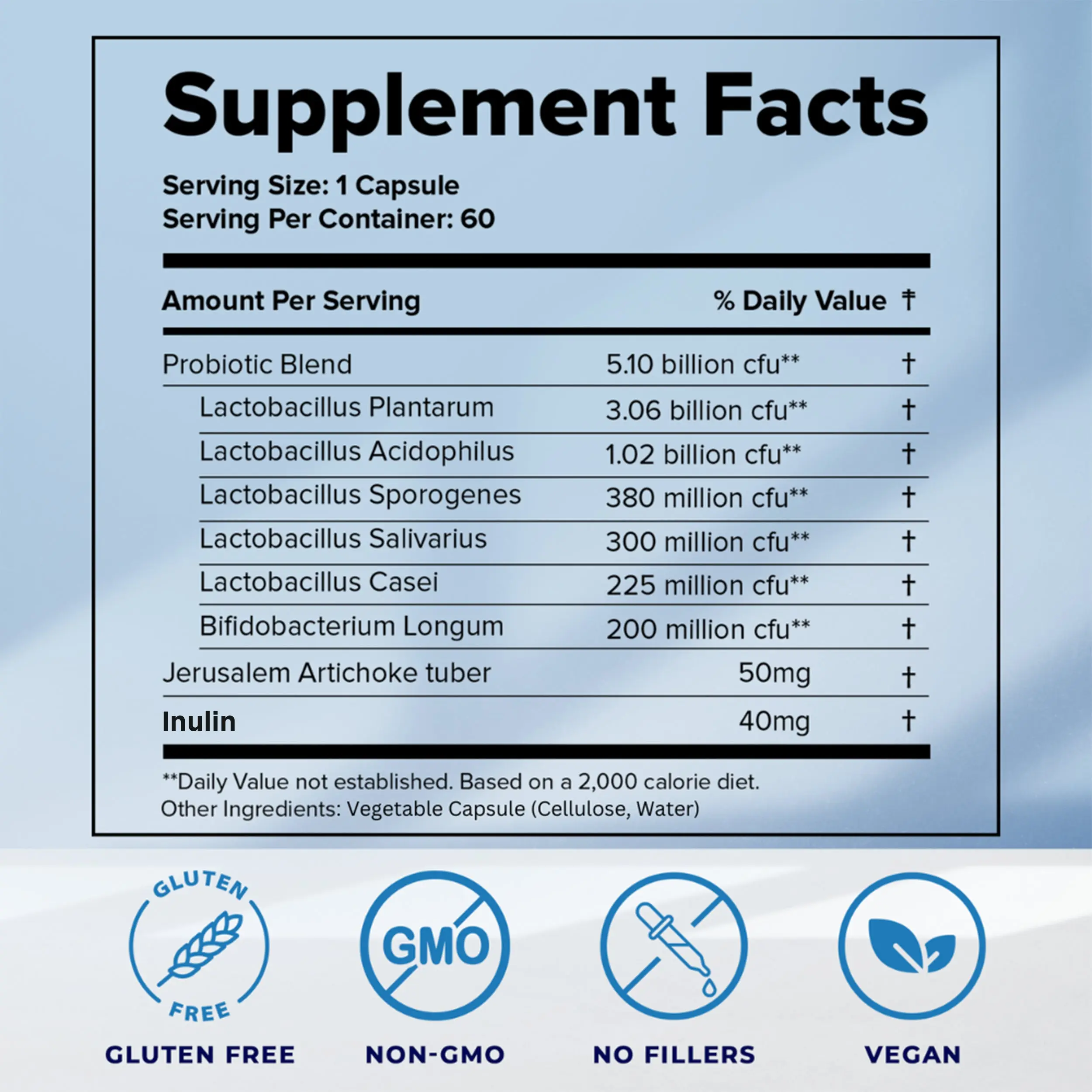 Lactobacillus Plantarum,Lactobacillus Acidophilus,Lactobacillus Sporogenes,Lactobacillus Salivarius,Lactobacillus Casei,Bifidobacterium Longum,Jerusalem Artichoke Tuber,Inulin,Vegetable Cellulose
