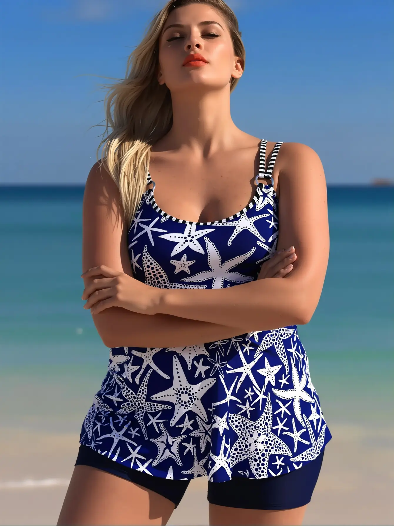 This starfish tankini is perfect for nautical lovers! The navy and white color combo is timeless, while the starfish print adds a playful beachy touch. The striped straps with metal rings give it a polished look, and the swim shorts provide the coverage you want. The ruched top flatters your curves and the removable padding lets you customize your support!