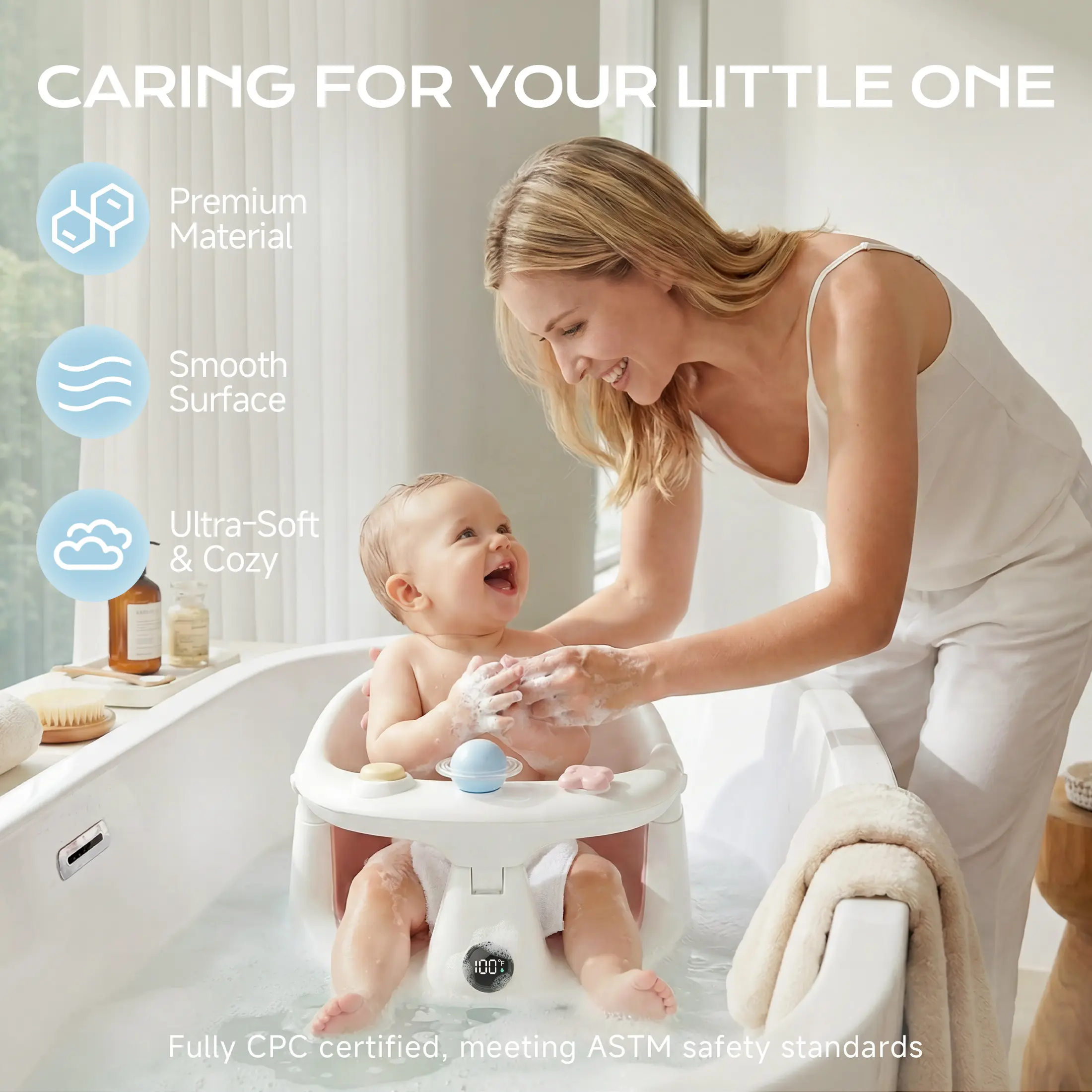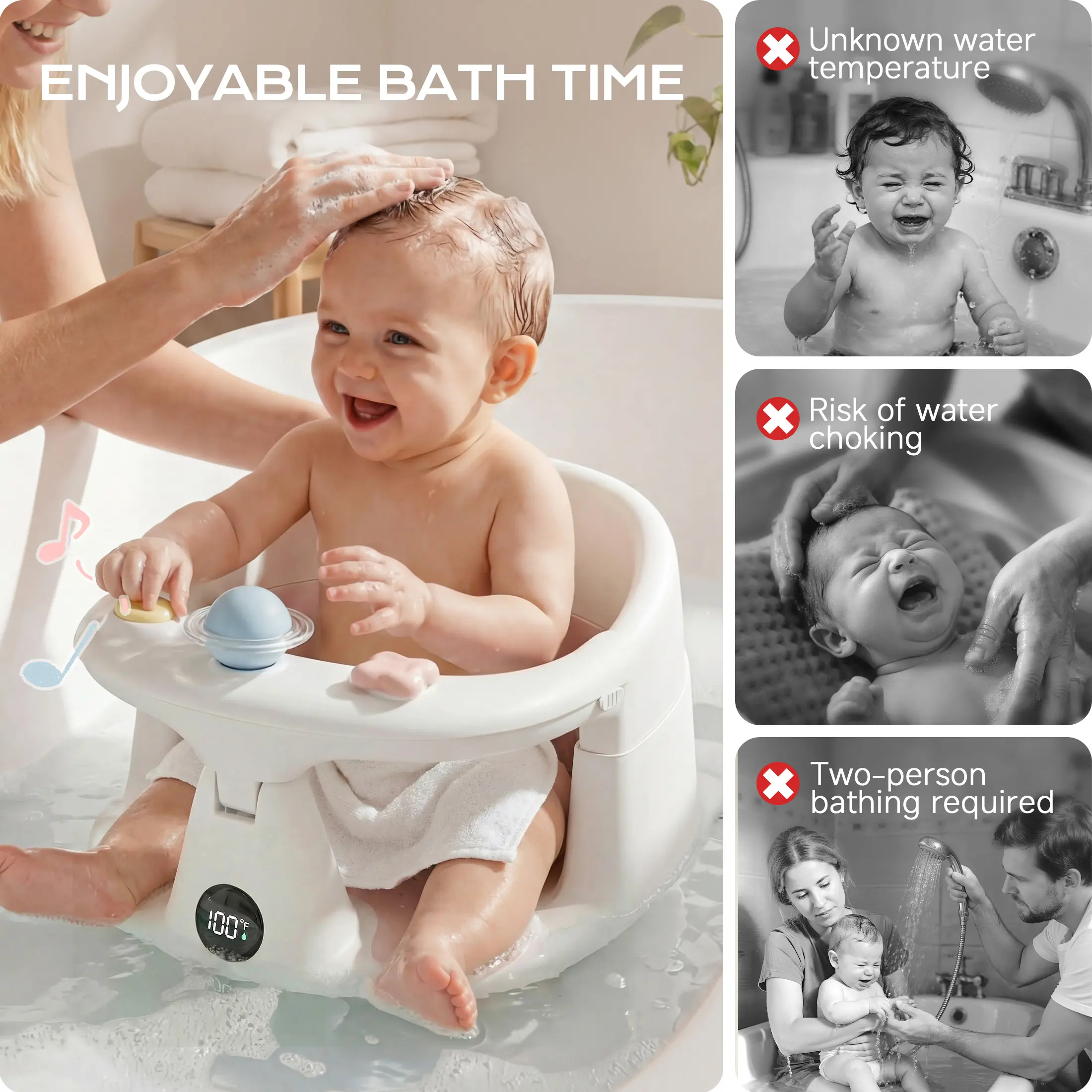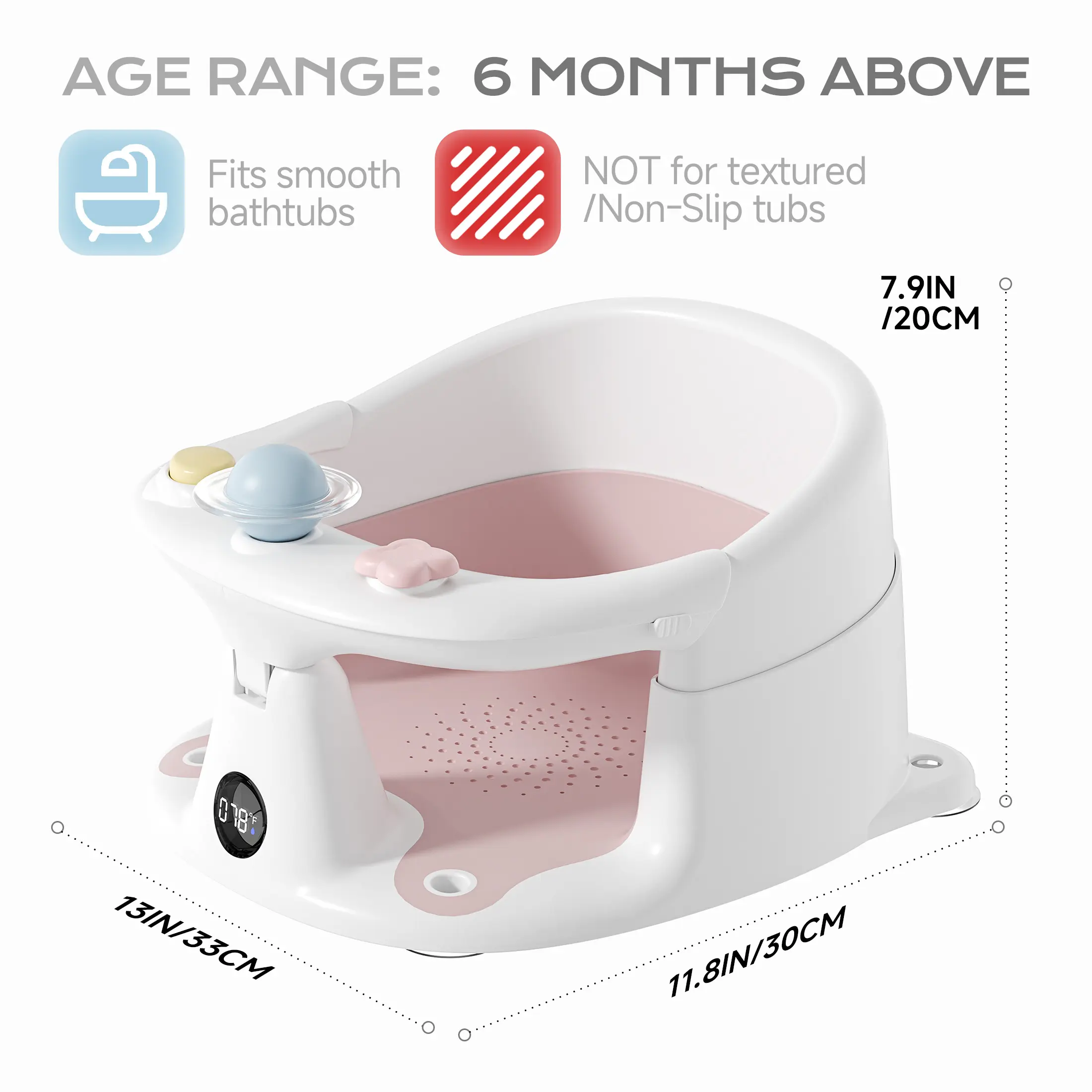 This bath chair is equipped with a built-in thermometer with clear color indicators: red (hot), blue (cold) and green (ideal), helping you easily check safe water temperature and protect babies from scald or chills. It also includes certified safe toys like a sound button and rotating balls to attract baby’s attention, letting you clean your baby quickly and happily.