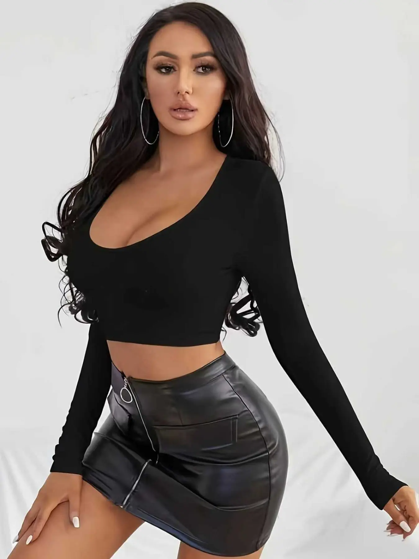 Women's Ruffle Hem Short Fitted Long Sleeve Top, Stylish Casual Wear, Perfect for Daily, Comfortable and Trendy Design