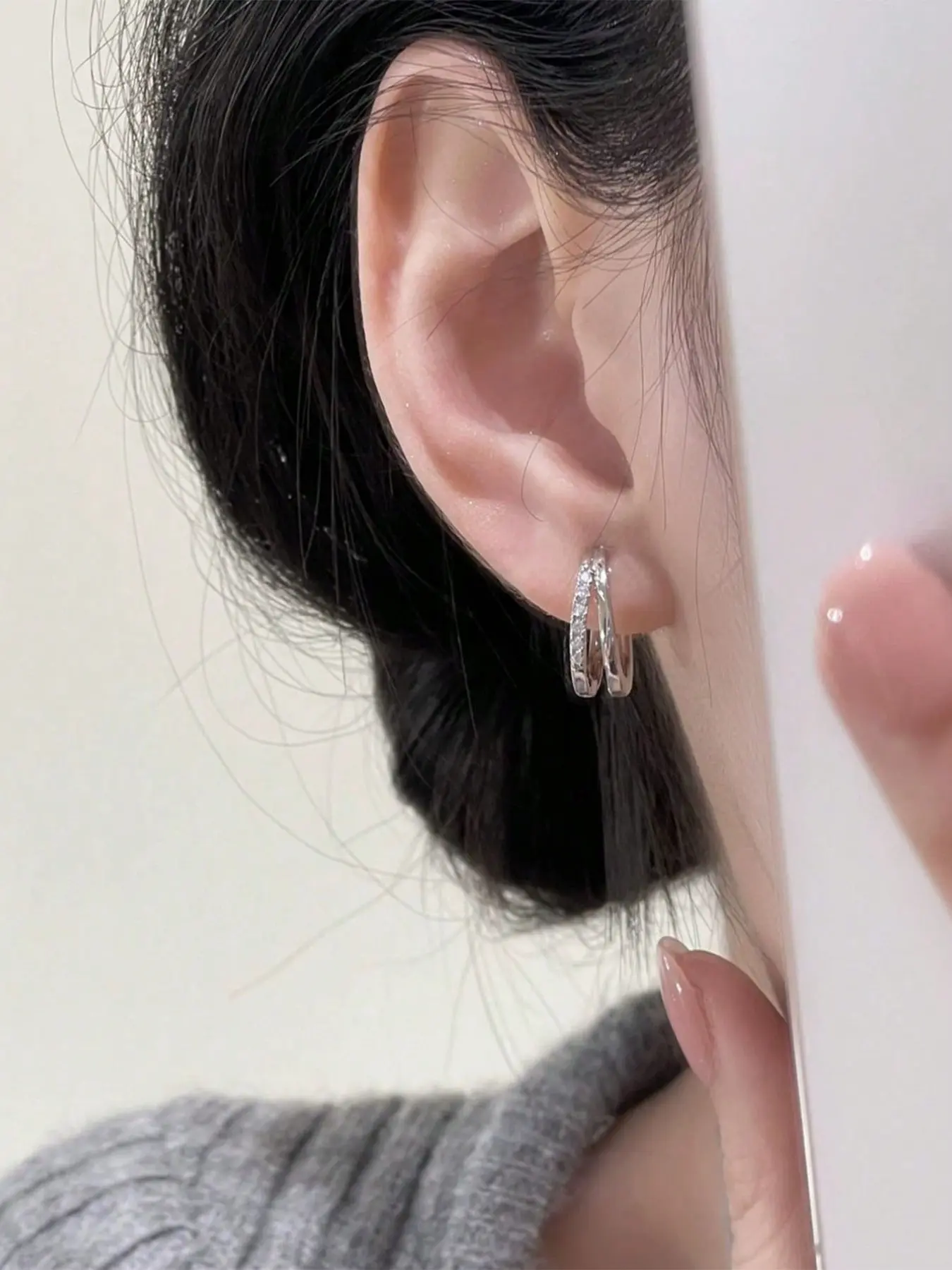 5. 1 pair of ladies earrings, modern style double ring zircon inlay for daily wear, birthday gift, Mother's Day