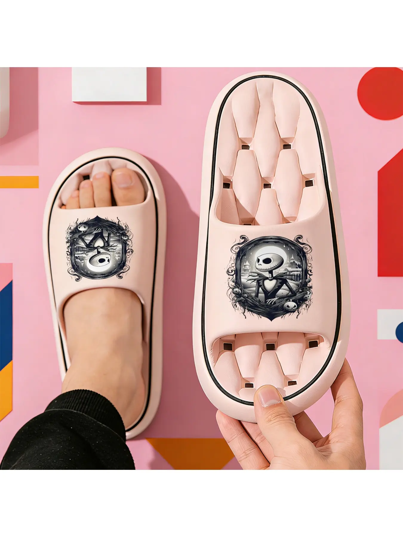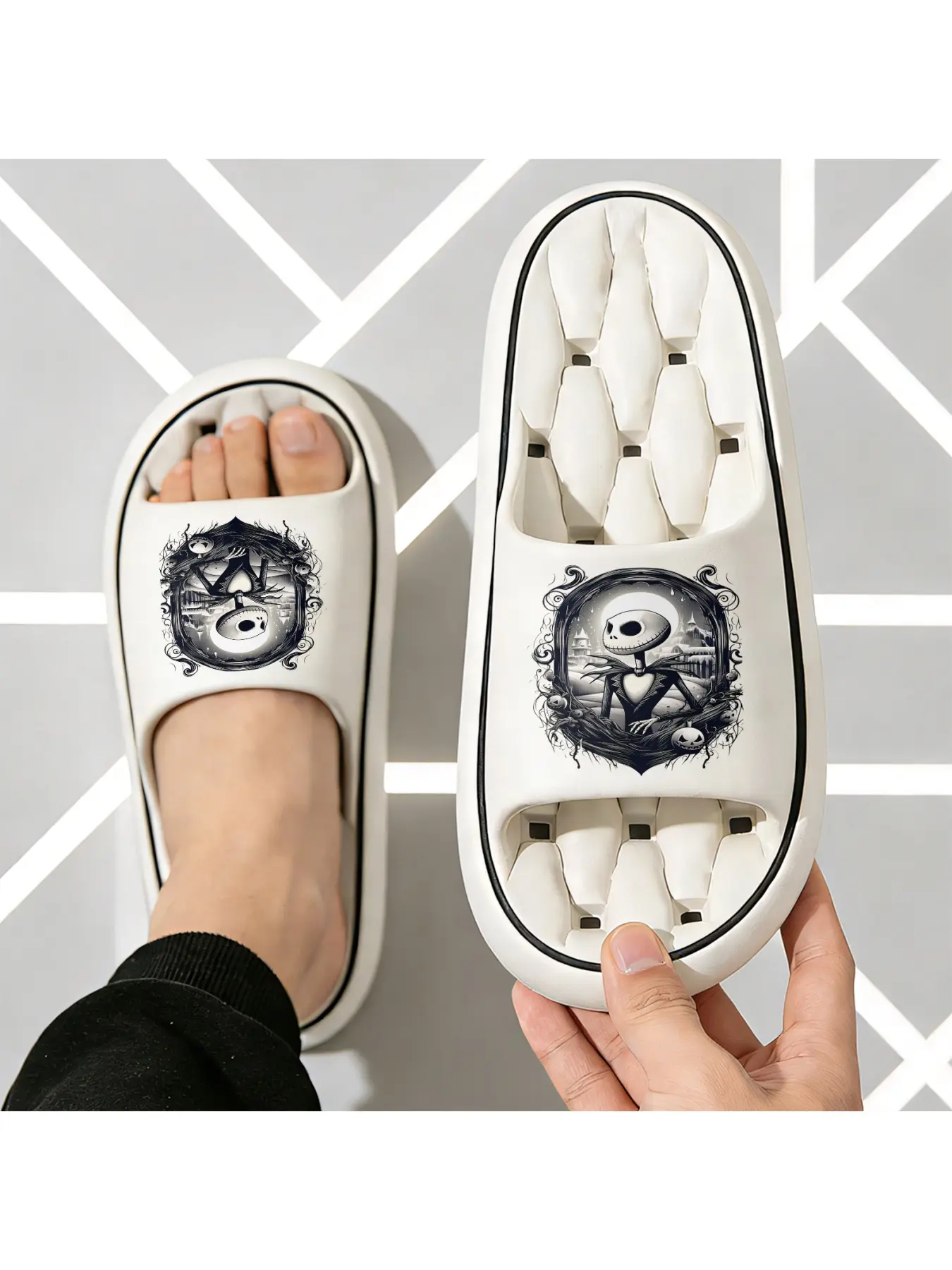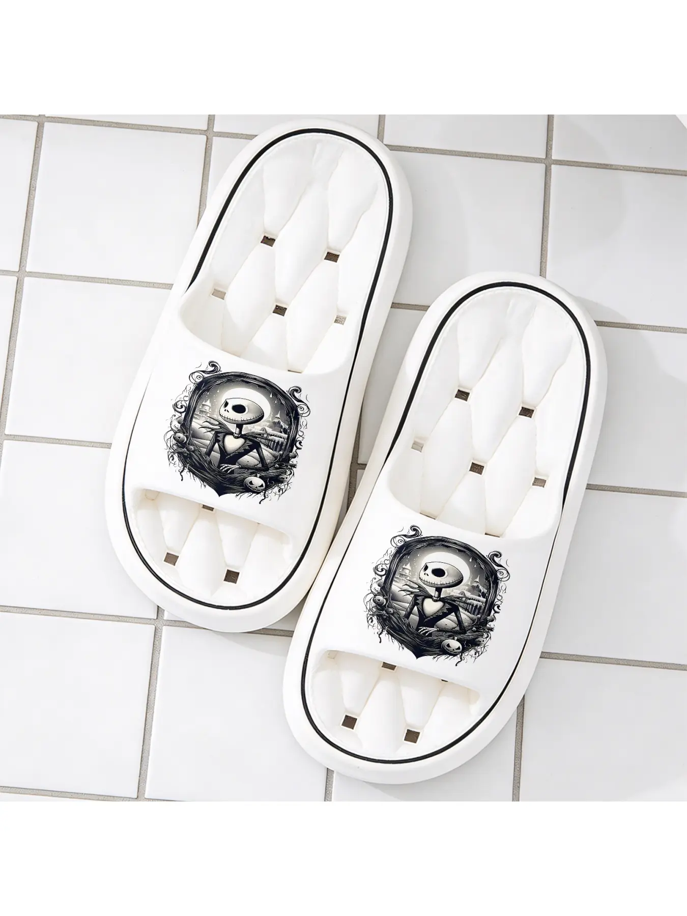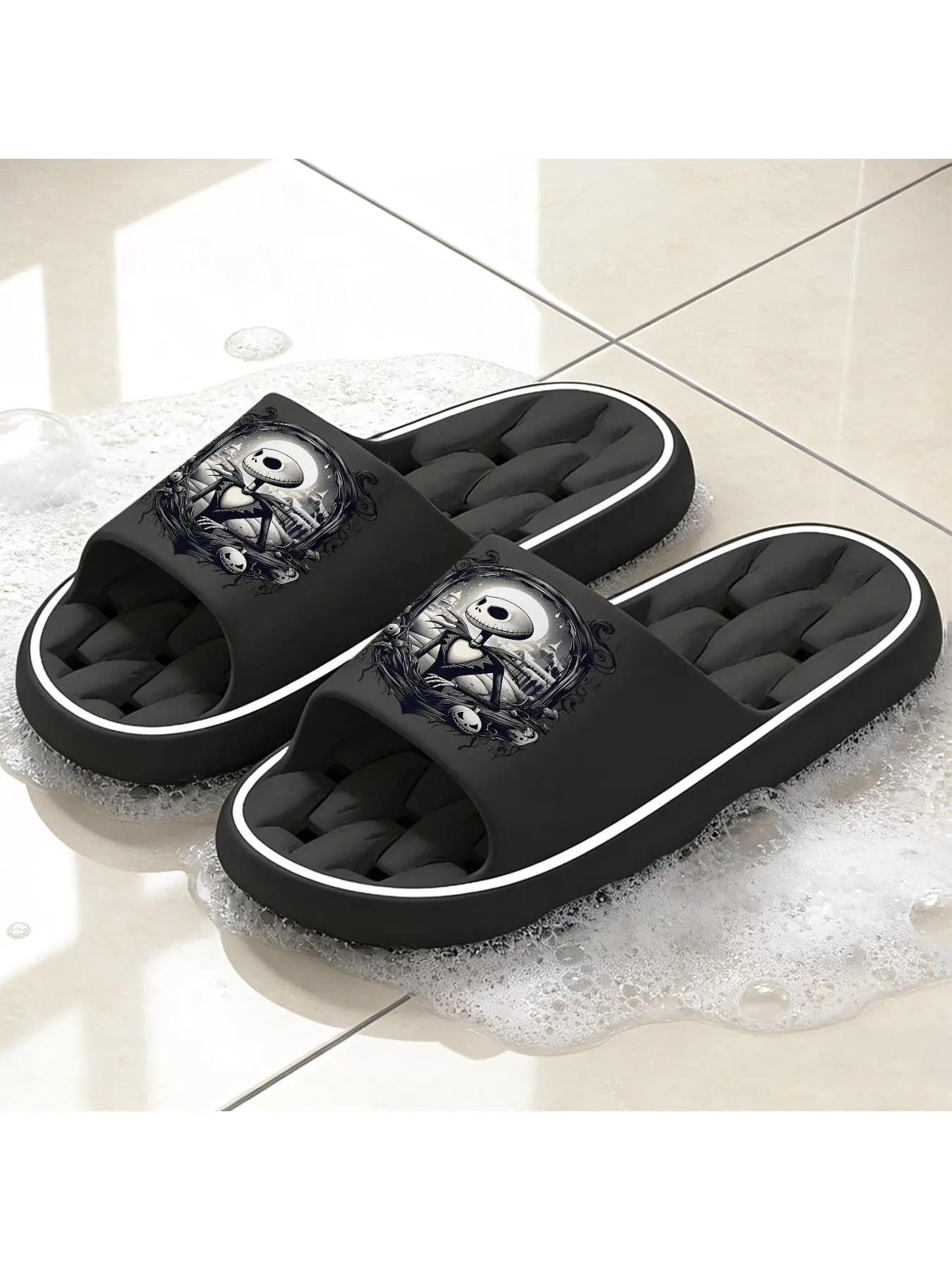 Halloween The Nightmare Before Christmas Jack Skellington Print Slippers Unisex Soft Sole Slides For Indoor And Outdoor Wear Halloween Party Cosplay Footwear Comfortable Non Slip Dark Style Casual Slipp