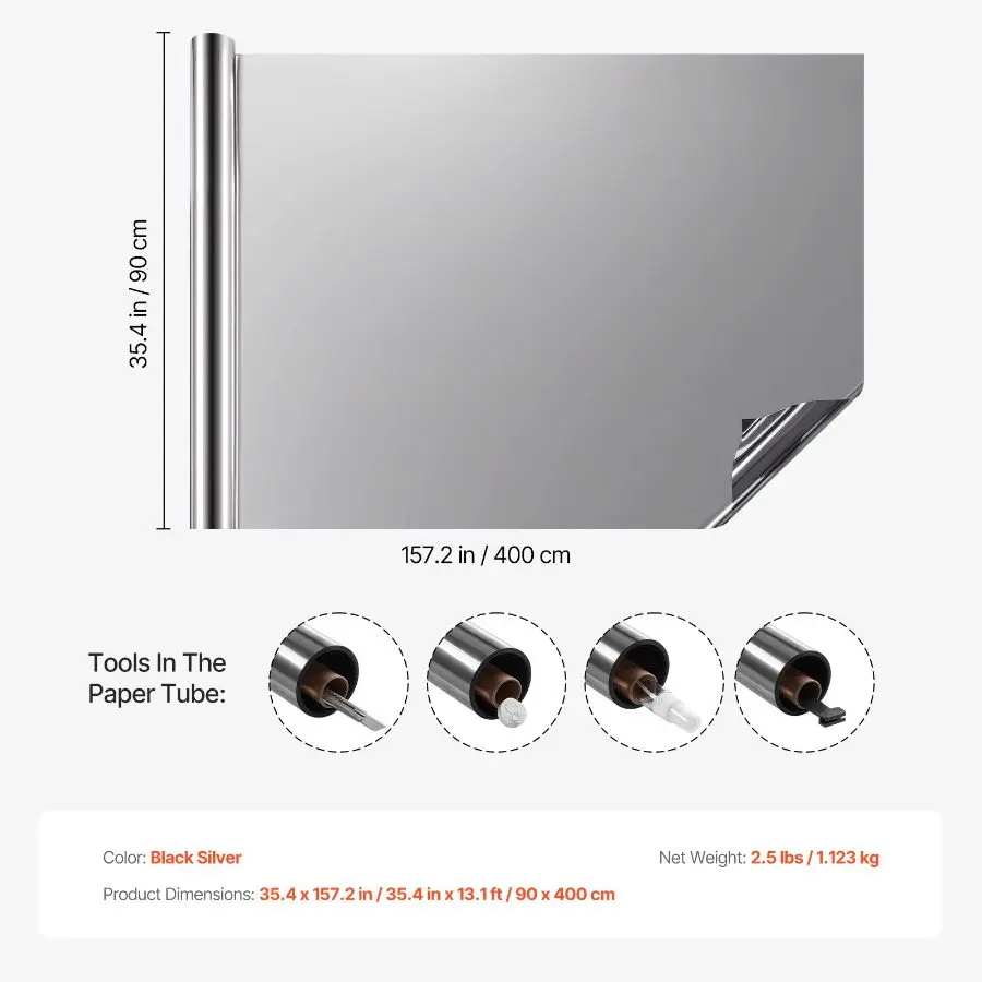 VEVOR Window Privacy Film, One Way Window Tint, Daytime Mirror Reflective Heat Control Glass, Static Cling Sun Blocking See out Not in Window Film for Home and Office, Black-Silver, 35.4 inx 13.1 ft