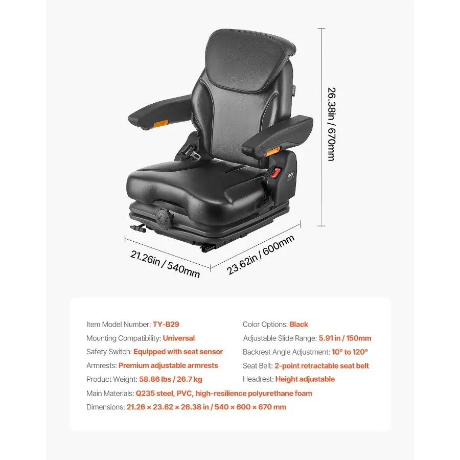 VEVOR Universal Forklift Seat, Tractor Suspension Seat with Adjustable Back, Armrest, Headrest Safety Belt, Secure Fold Down Tractor Seat with Micro Switch, Lawnmower Seat for Skid Loader Bulldozer