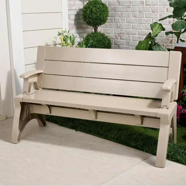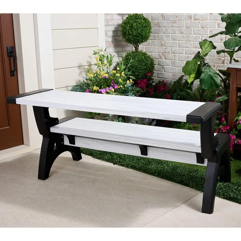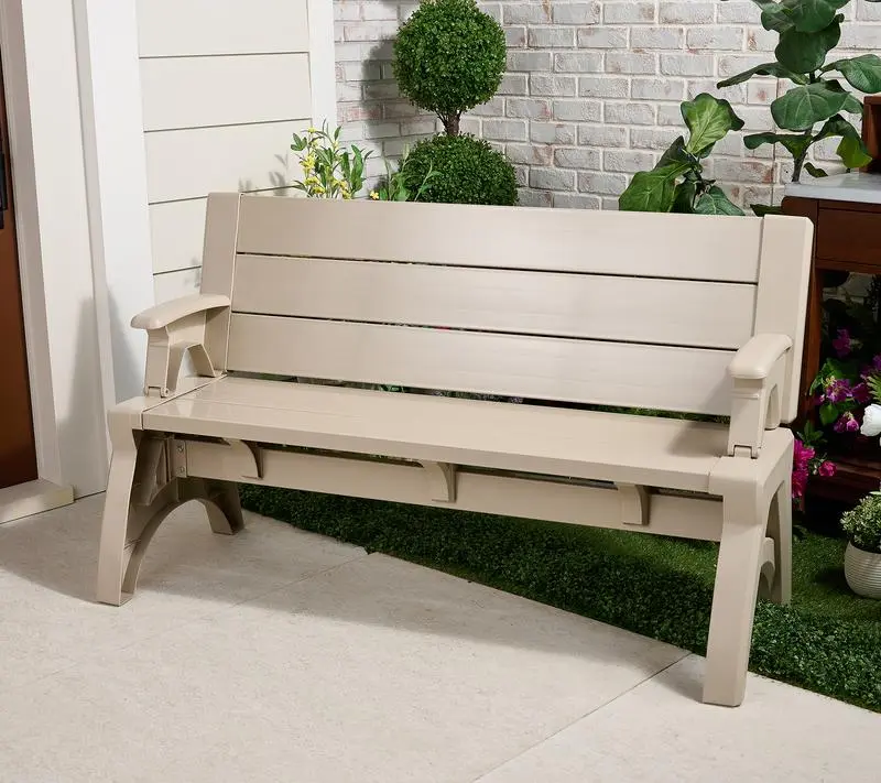 Made of strong, durable resin and vinyl for outdoor or indoor use, this multi-functional and space-saving design creates a comfortable place to relax. The backrest transforms into a tabletop, so you can adjust it for any situation -- like a surface where the kids can craft or perhaps a place for an impromptu picnic on the porch. It's a sturdy setting for life's moments that mean so much. From Convert-A-Bench.