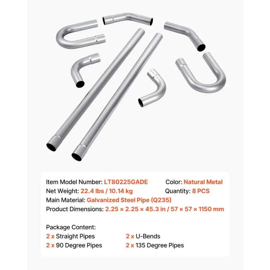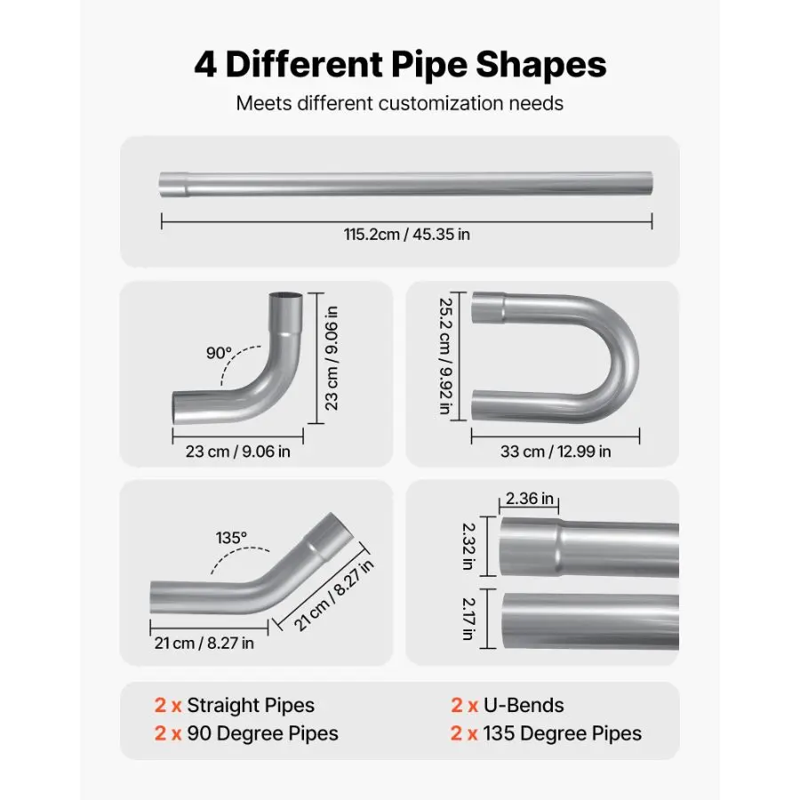 This exhaust pipe kit includes two straight pipes, two U-bends, two 90 pipes, and two 135 pipes. It meets your vehicle's exhaust system needs for replacement, repair, or customization.