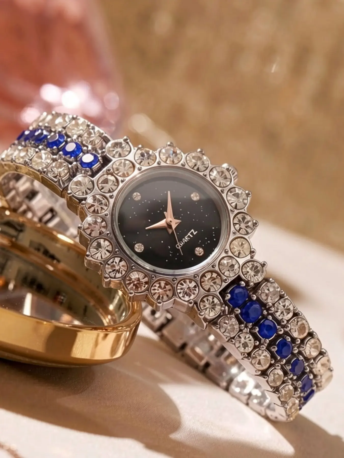 Mother's Day Gift Set, Full Diamond Blue Sapphire Women's Watch, Lip Liner, Foundation, Powder Compact, Silver Color Case, Casual Style