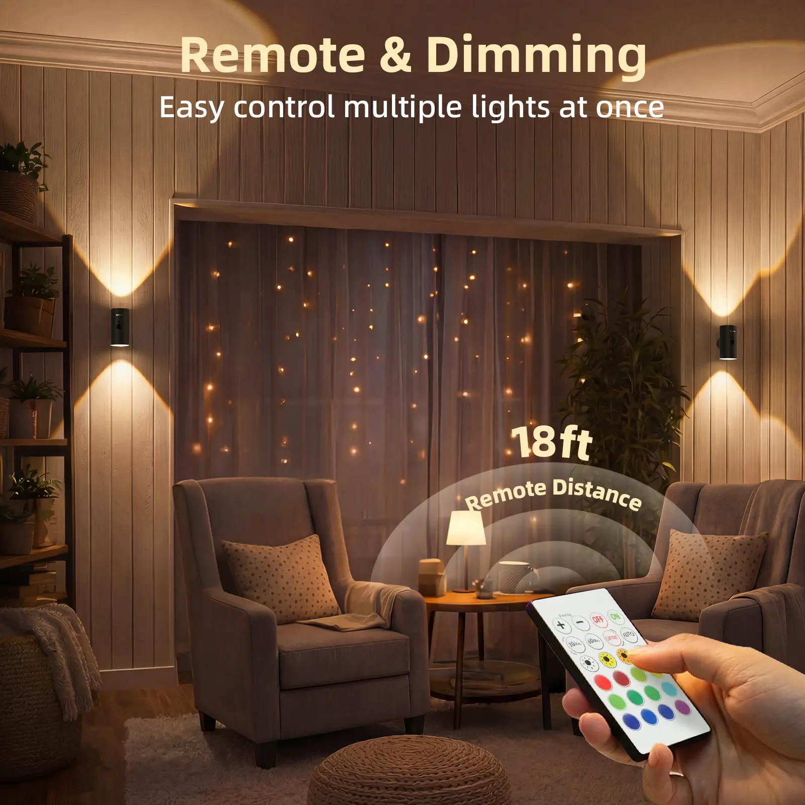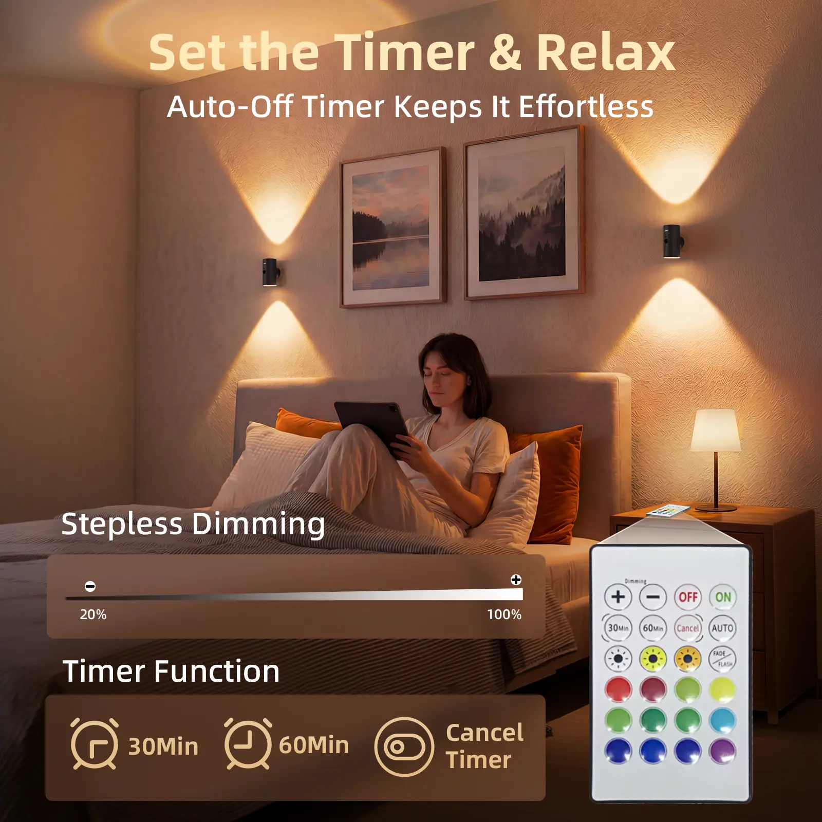 【Remote Control with Timer & Dimming】Adjust brightness, switch color temperatures or RGB modes, and set 30 or 60-minute timers with the included remote (up to 16 ft). Perfect for relaxing evenings, movie time, or nighttime use without getting up.