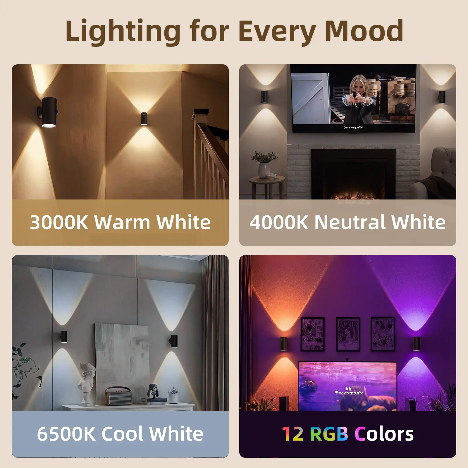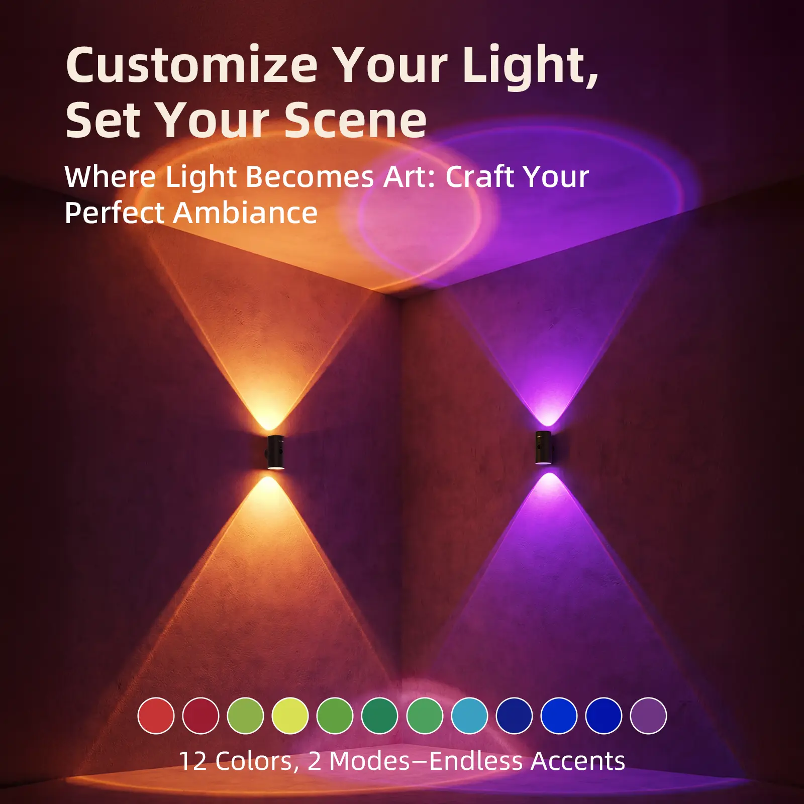 【Up & Down Glow – Small but Stylish】Designed to cast a soft wall-washing light, this compact wall light adds a subtle yet elegant touch to your space. Choose from warm (3000K), natural (4500K), or cool white (6500K), plus 12 RGB colors to match different moods—ideal for adding gentle ambient light to living rooms, hallways, or accent walls.