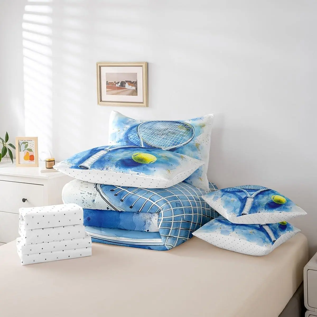 Available Size:Twin Size:1 comforter 68 inch x 90 inch,1 fitted sheet 39 inch x 75 inch x 16 inch,1 flat sheet 67 inch x 96 inch,2 pillowcases 20 inch x 30 inch,2 throw pillow covers 18 inch x 18 inch; Full Size:1 comforter 79 inch x 90 inch,1 fitted sheet 55 inch x 75 inch x 16 inch,1 flat sheet 81 inch x 96 inch,2 pillowcases 20 inch x 30 inch,2 throw pillow covers 18 inch x 18 inch; Queen Size:1 comforter 90 inch x 90 inch,1 fitted sheet 60 inch x 80 inch x 16 inch,1 flat sheet 90 inch x 102 inch,2 pillowcases 20 inch x 30 inch,2 throw pillow covers 18 inch x 18 inch; King Size:1 comforter 104 inch x 90 inch,1 fitted sheet 70 inch x 80 inch x 16 inch,1 flat sheet 90 inch x 106 inch,2 pillowcases 20 inch x 36 inch,2 throw pillow covers 18 inch x 18 inch.