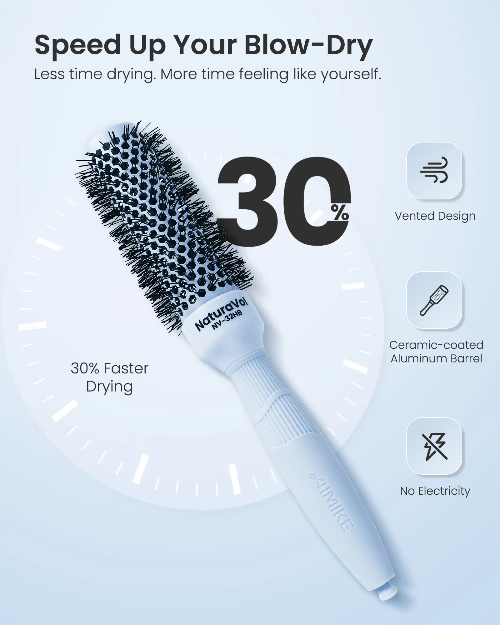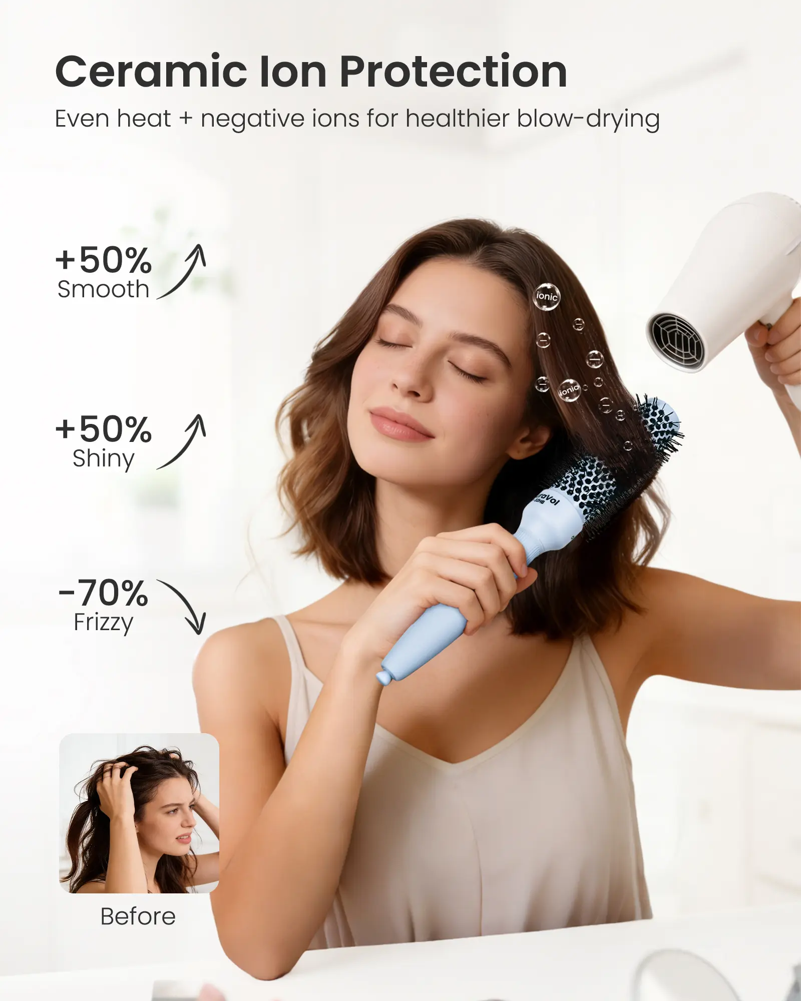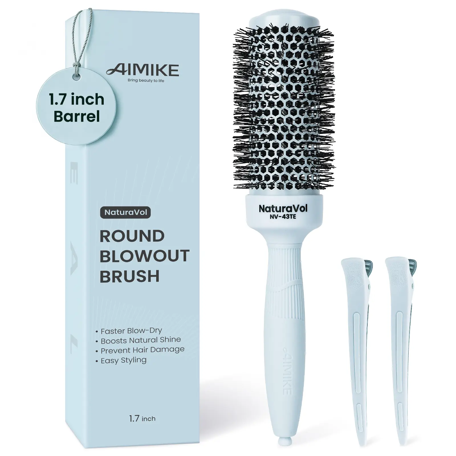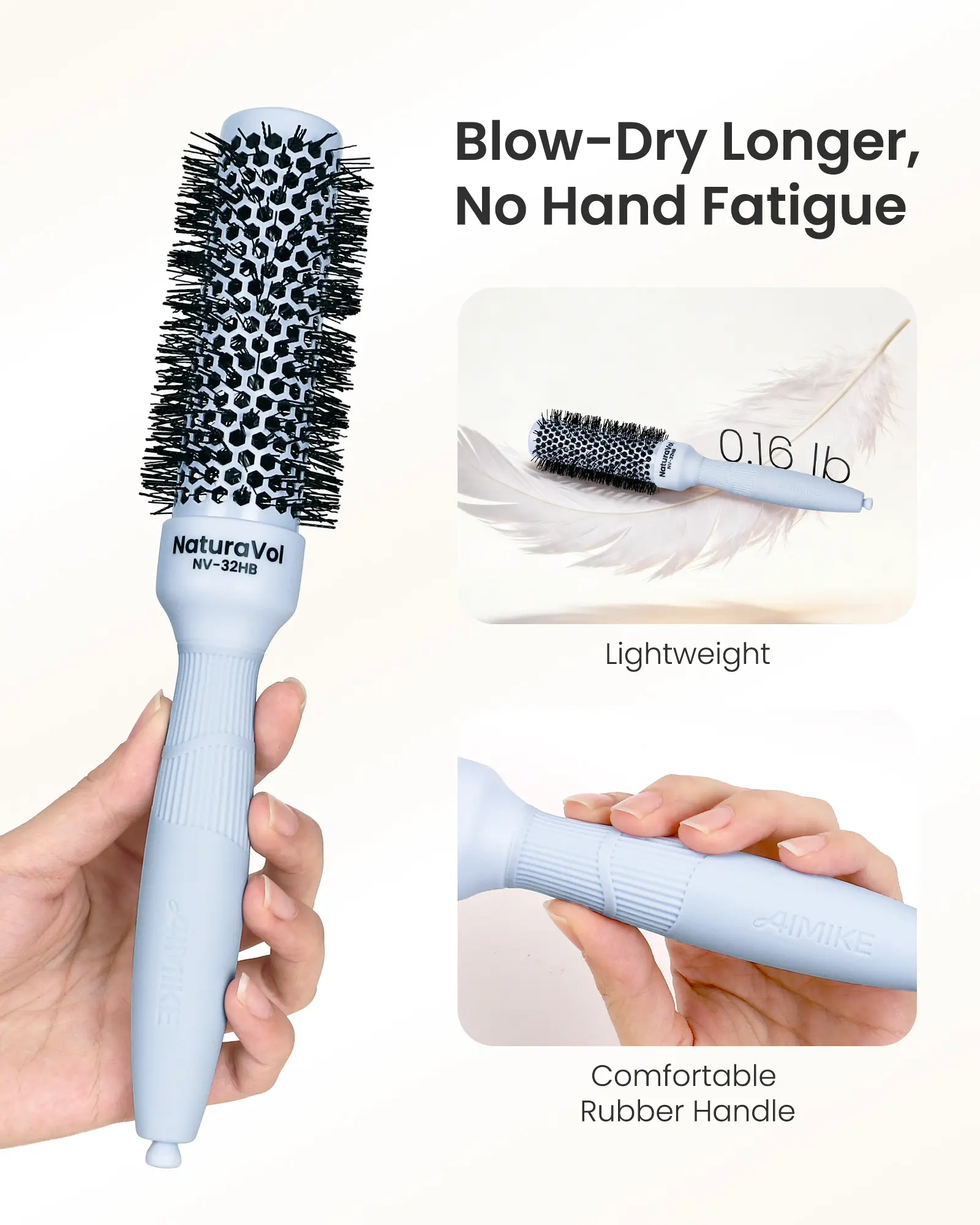 ·【Nano Thermal Ceramic Ion Technology - Hair-Friendly & Smoother】The AIMIKE round brush features a nano ceramic-coated barrel that distributes heat evenly while drying hair faster and protecting it from damage. It releases negative ions to neutralize static, leaving hair smooth, shiny, and healthy without frizz.