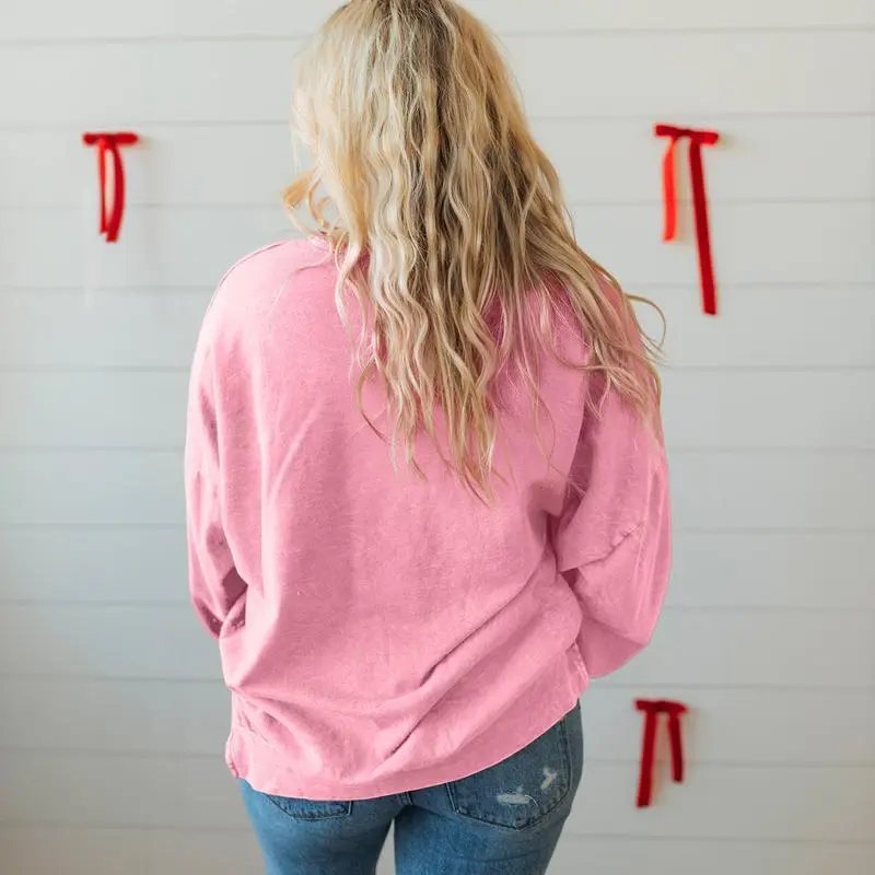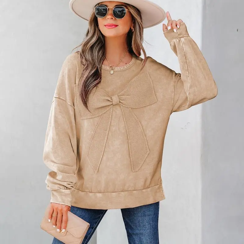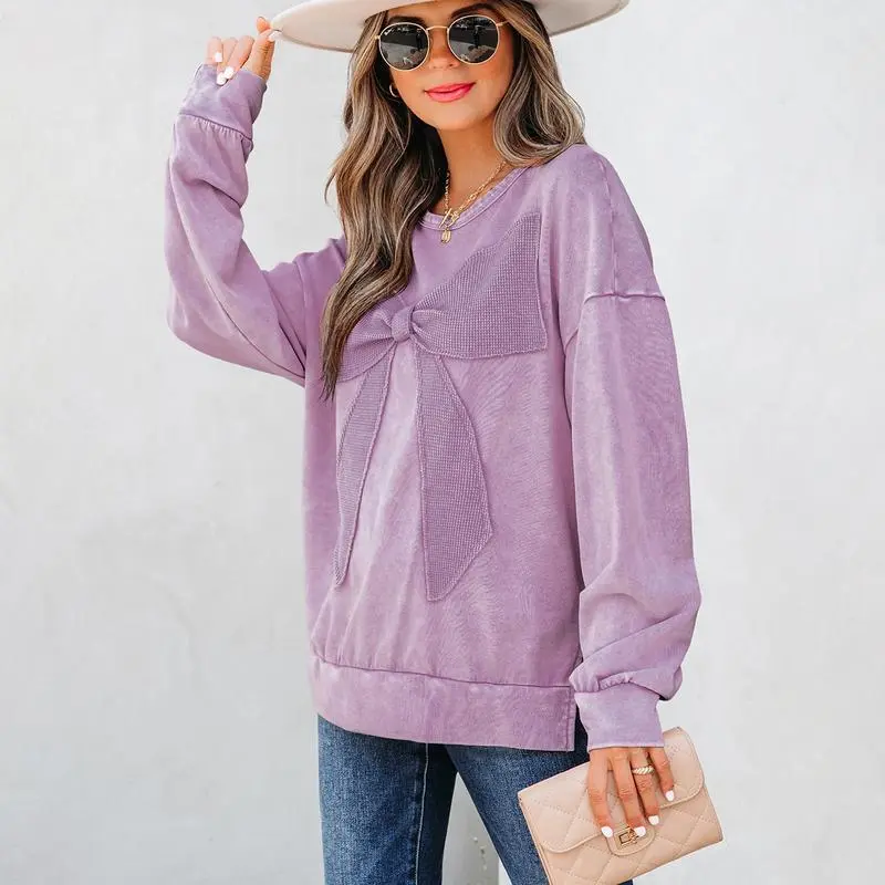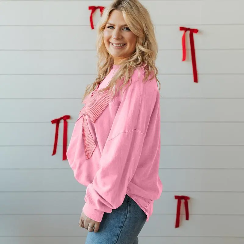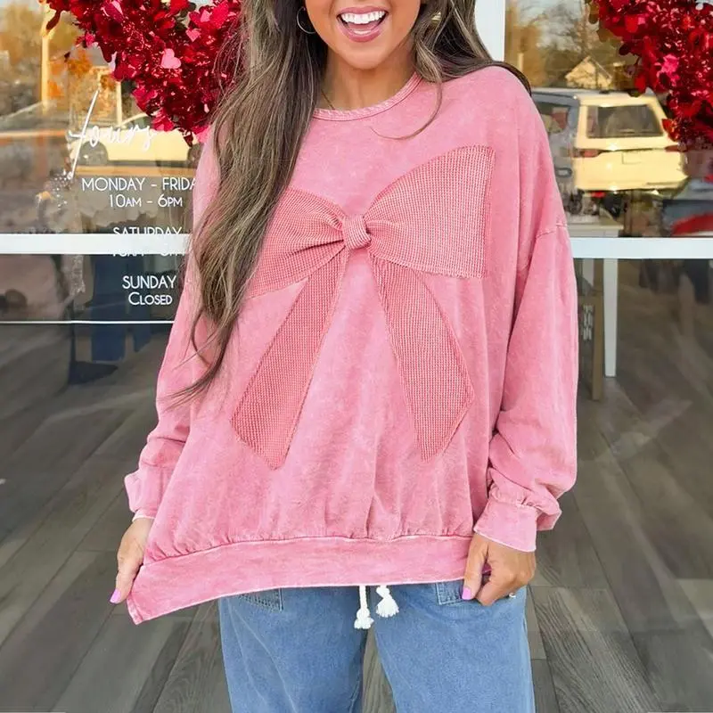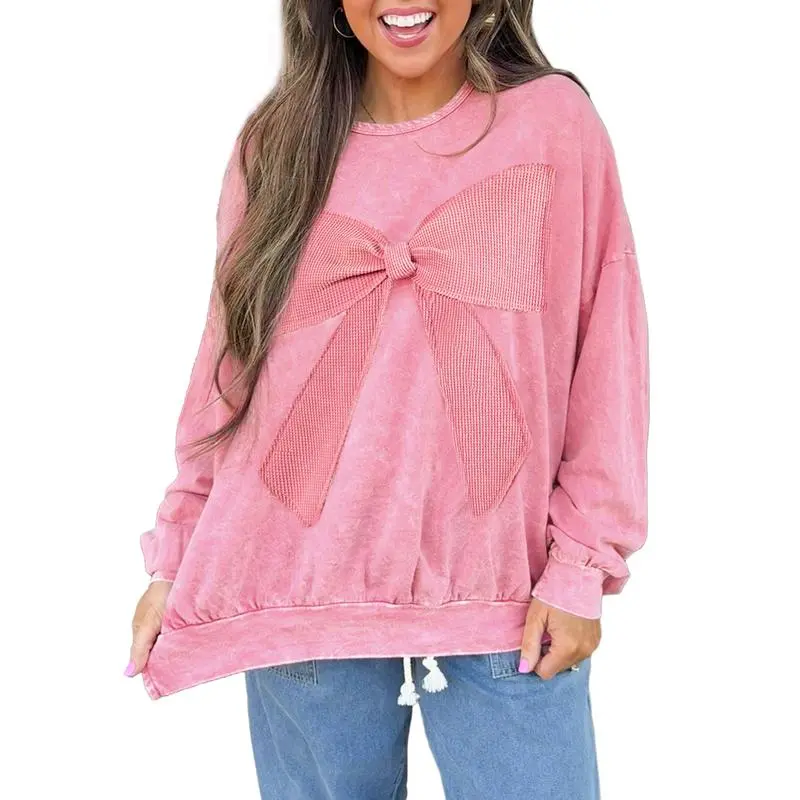 Mineral Wash Big Bow Patchwork Pullover Sweatshirt Full Size Range Available in Size S-4X Both for Plus Size & Regular