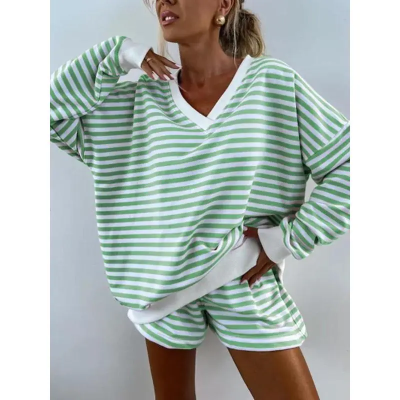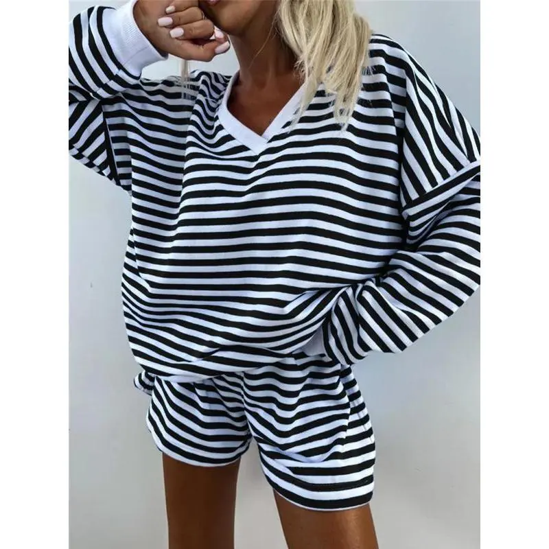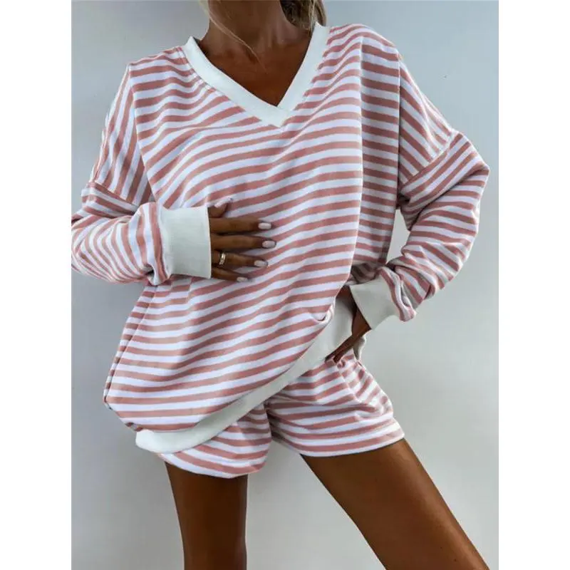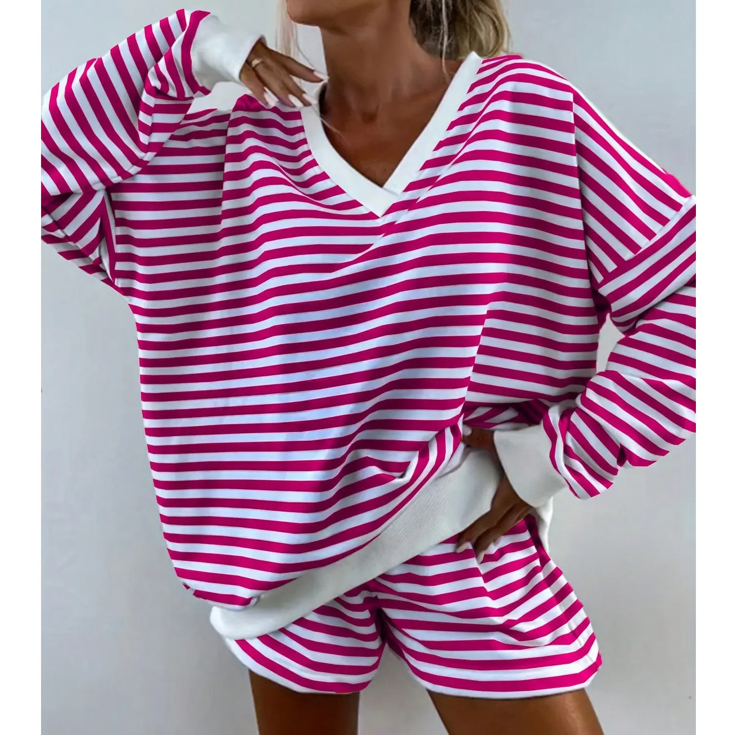 Two-piece Set Women's Striped Print V Neck Drop Shoulder Sweatshirt & Elastic Waist Shorts Loungewear Casual Comfy Pajama Chic Set for Spring & Fall Sleepwear Women'swear Apparel