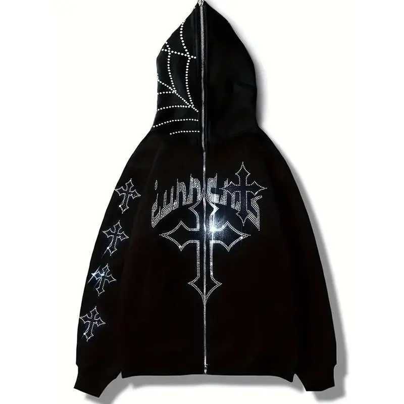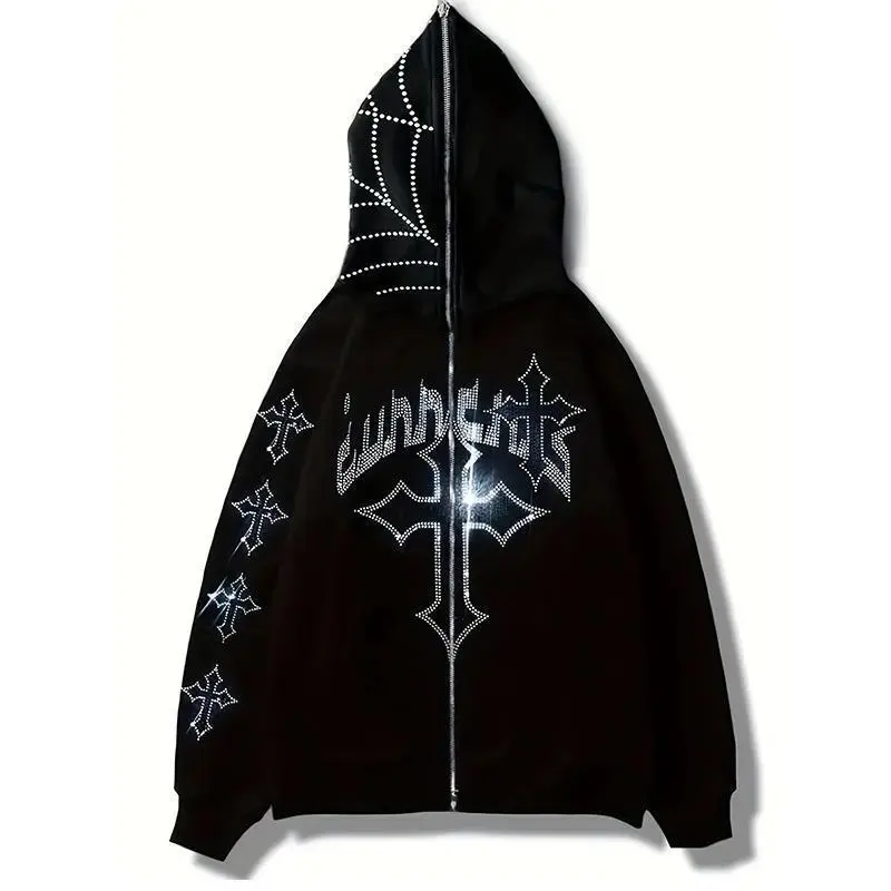 Street Tide Gothic Dark Long Sleeve Sweatshirt Ladies Casual Loose Top Y2K Fashion Hoodie Rhinestone Letter Cross Print Hoodie