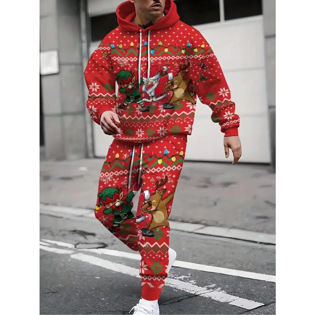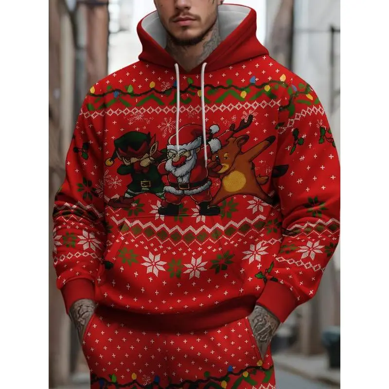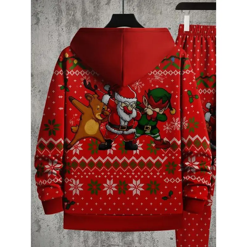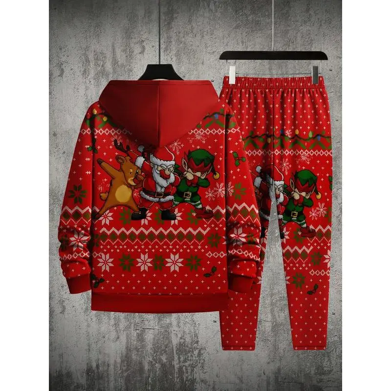 ��Unique Christmas Print��: Featuring a festive reindeer and elf art print, this outfit embodies holiday spirit and seasonal charm. ��Fitted Structure��: Designed to fit closely, providing a tailored look that accentuates the wearer's figure while ensuring mobility. ��Long Sleeve Coverage��: The long sleeves keep you warm, making this set suitable for fall and winter outdoor activities. ��Utility Pants��: The below-the-ankle length of the pants offers a practical approach to comfort during running and casual outings. ��Dual Set Convenience��: This set includes both a hoodie and pants, combining two essential pieces of clothing for easy mix-and-match.