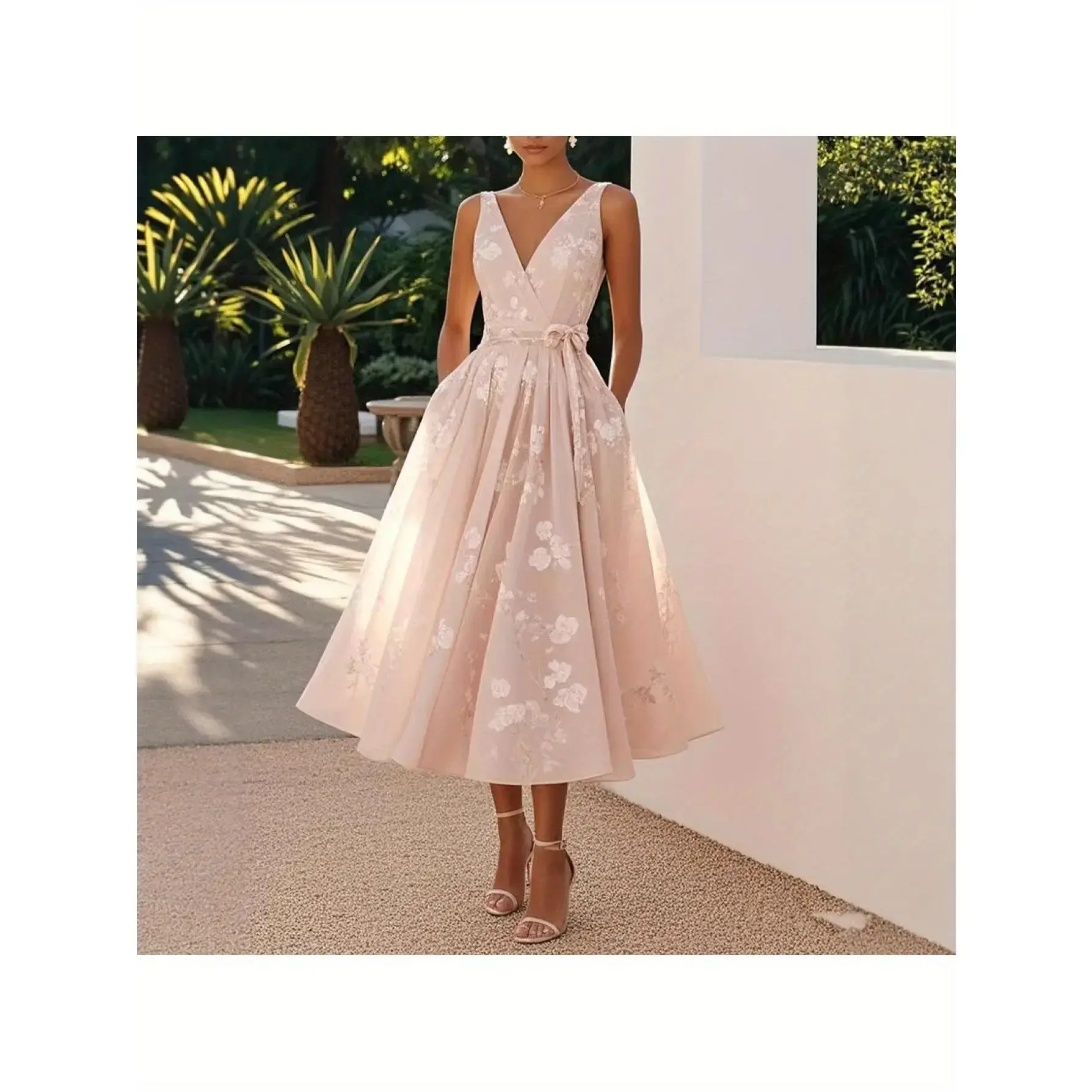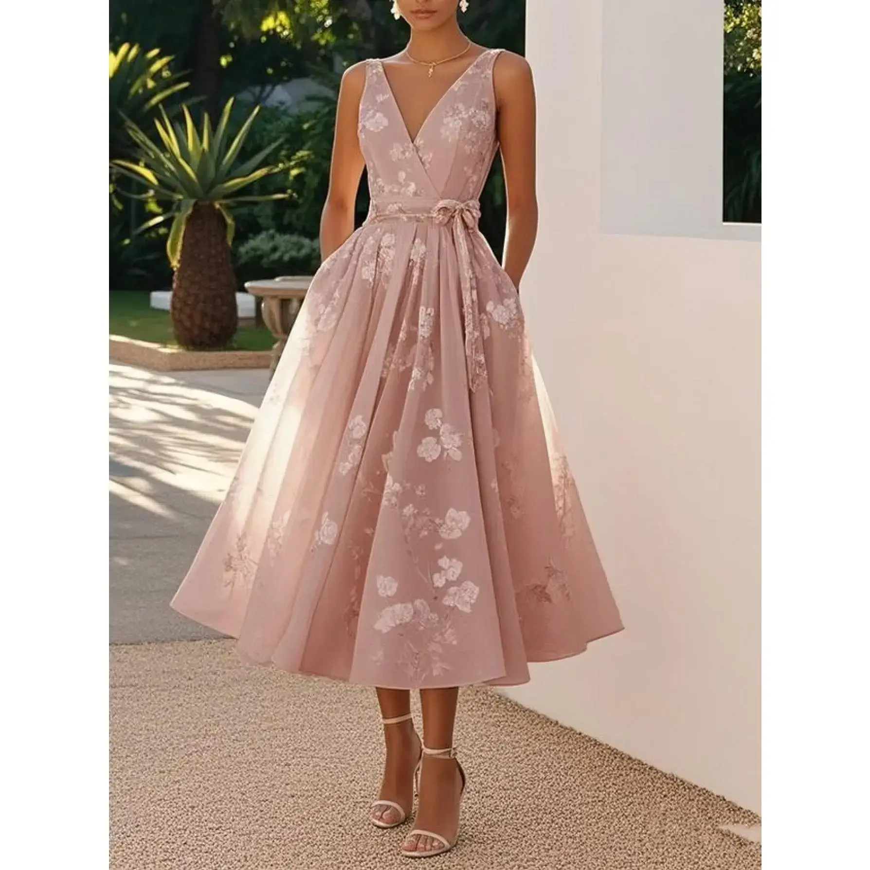Women's Formal Evening Dress - Elegant Sleeveless V-neck Long Soft Pink Dress, Suitable for Weddings, Dinners, Proms - All-season Party Outfit