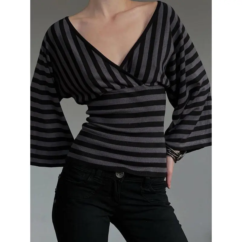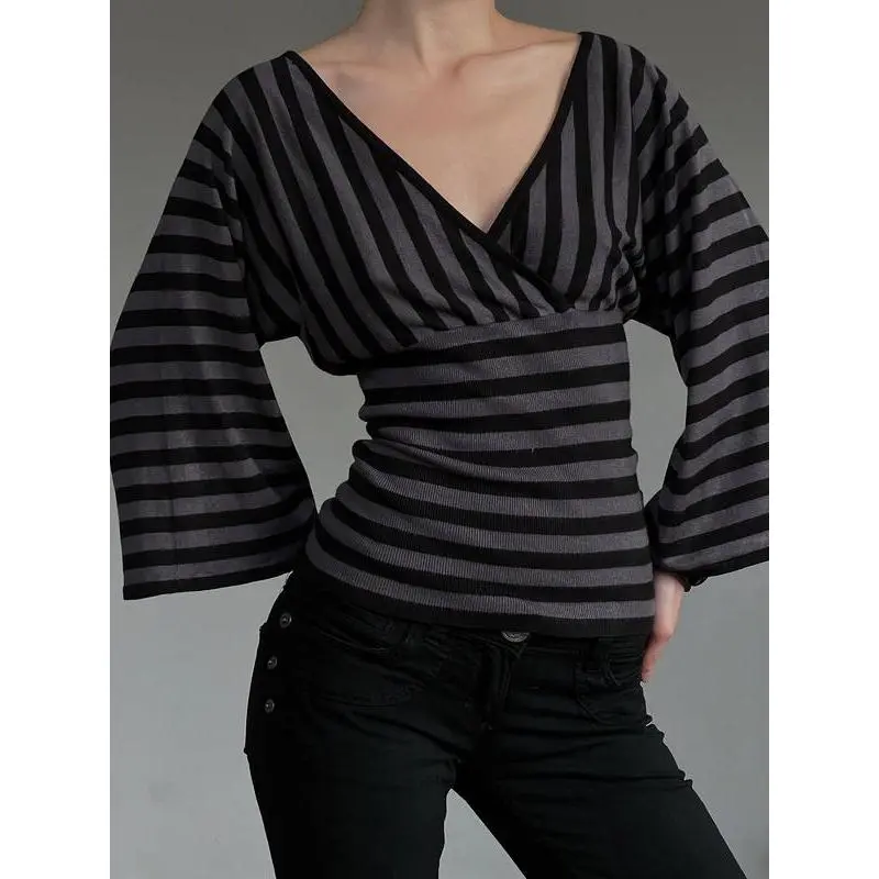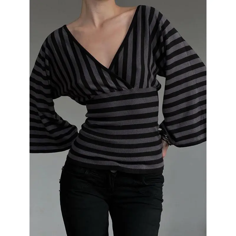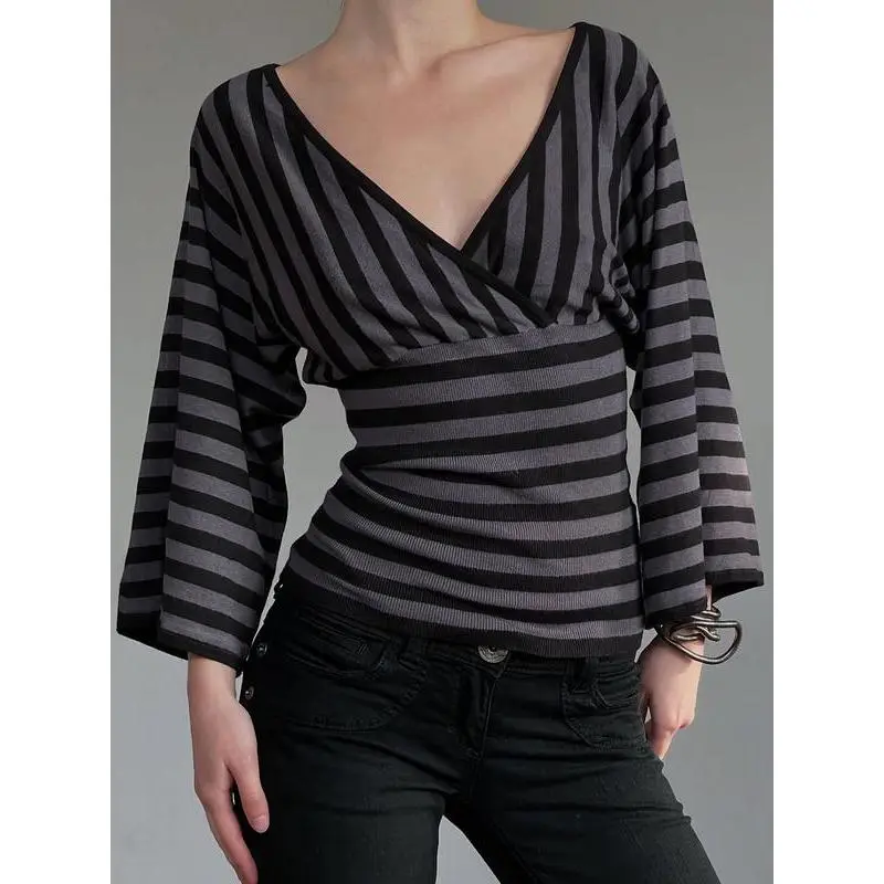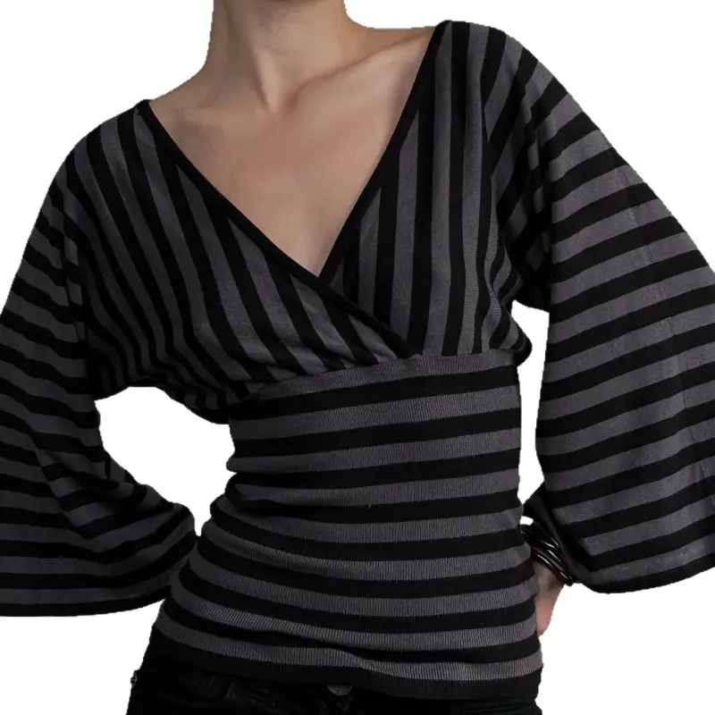 Women's Striped Cross V-Neck Slim-Fitting Casual Blouse Top, Long Sleeve Flare Sleeves, Spring & Fall Fashion Top