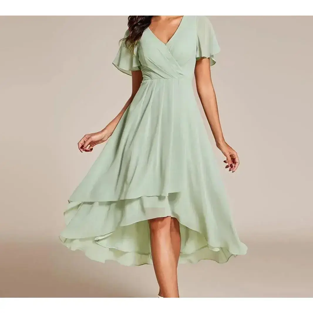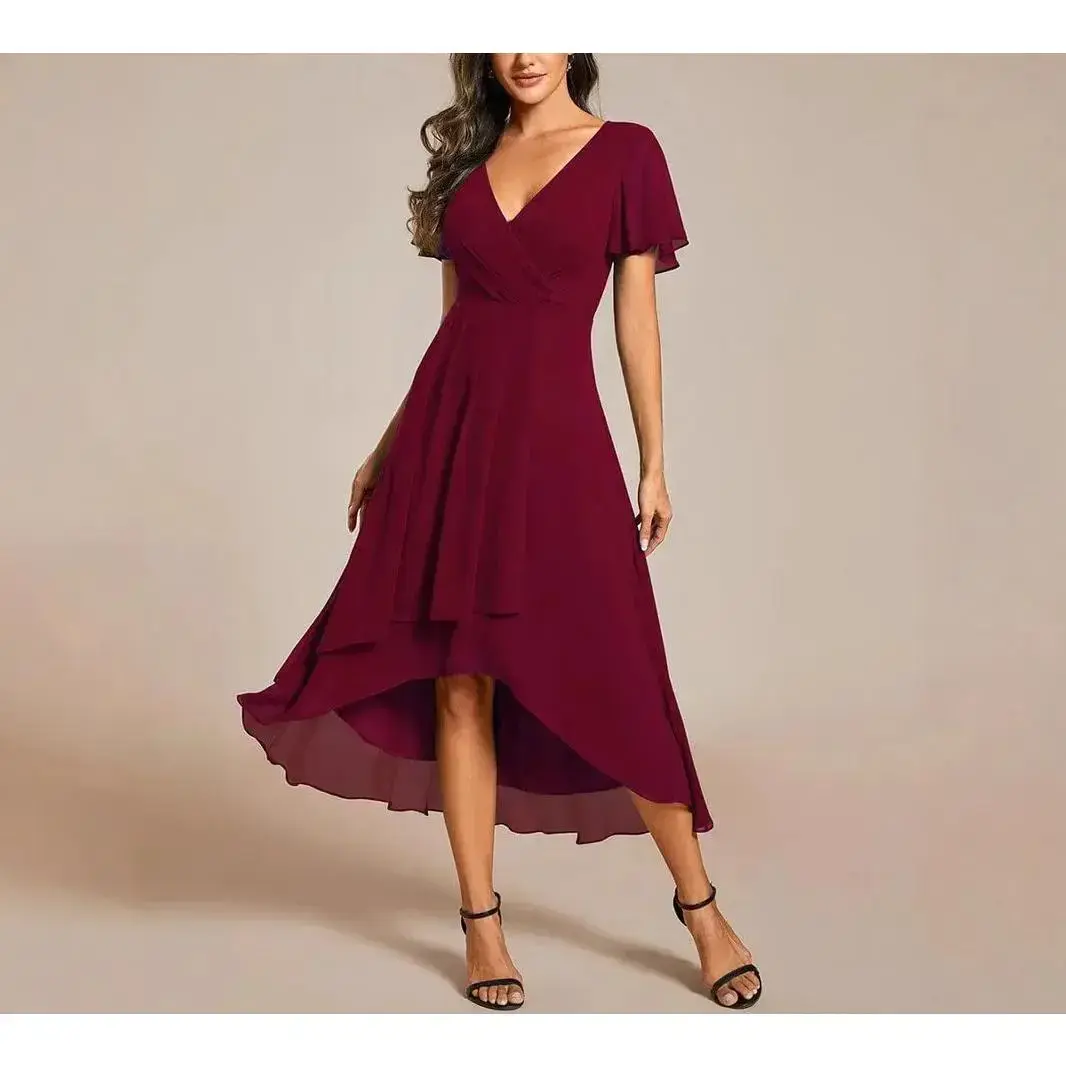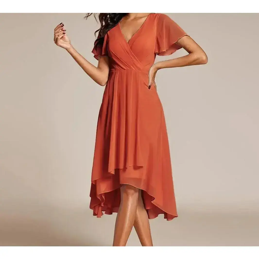 Women's Chiffon and Polyester Short-Sleeve A-Line Mid-Length High-Low Hem Dress with Lotus Leaf Flutter Sleeves and Surplice V-Neck for Wedding Guest Cocktail Party Thanksgiving Outfits