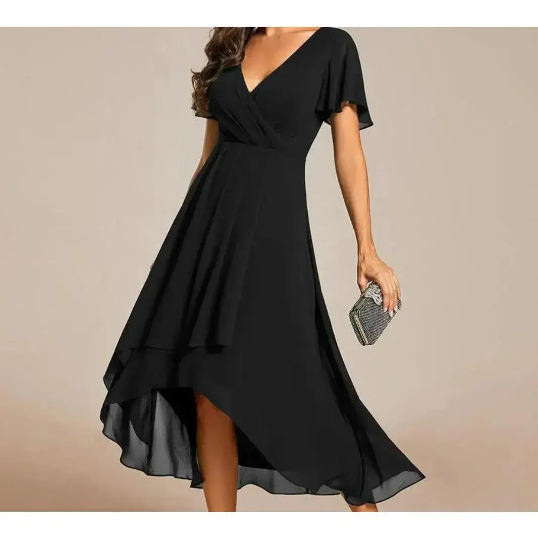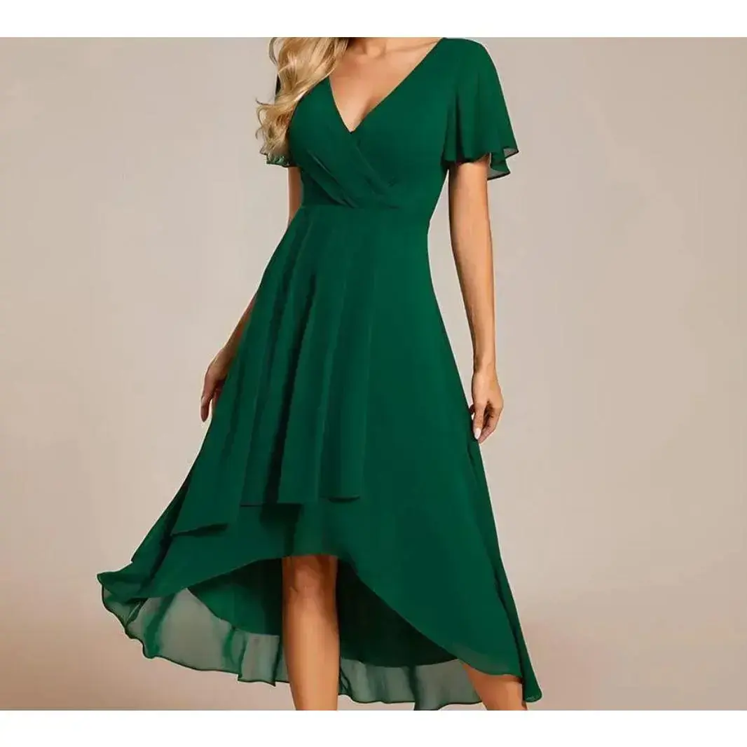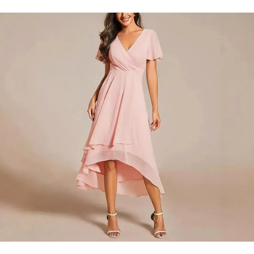 Women's Chiffon and Polyester Short-Sleeve A-Line Mid-Length High-Low Hem Dress with Lotus Leaf Flutter Sleeves and Surplice V-Neck for Wedding Guest Cocktail Party Thanksgiving Outfits