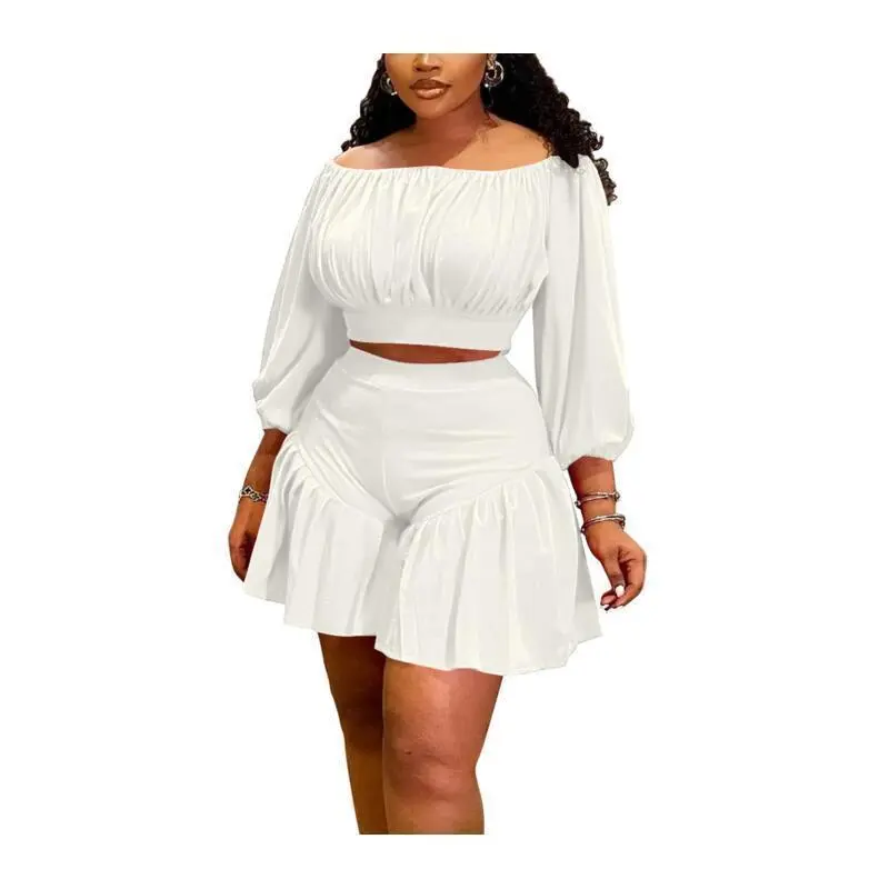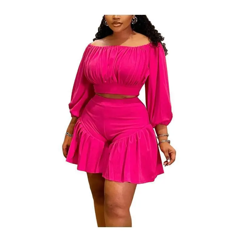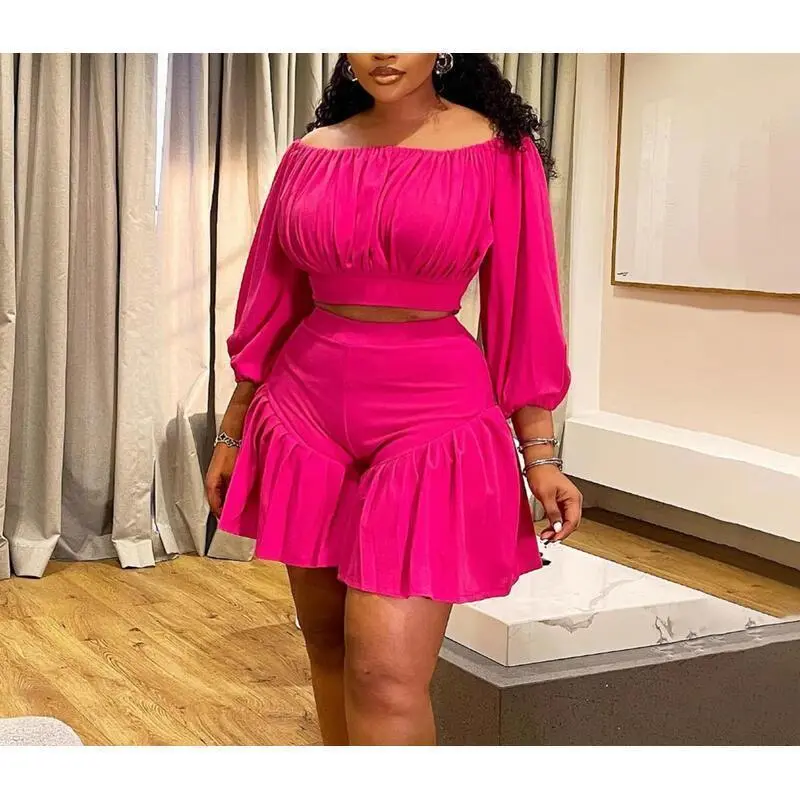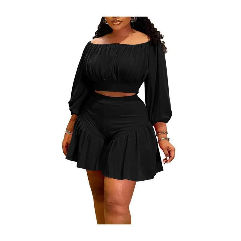 plus size women's new pleated one collar fluffy waist cinching casual two-piece set