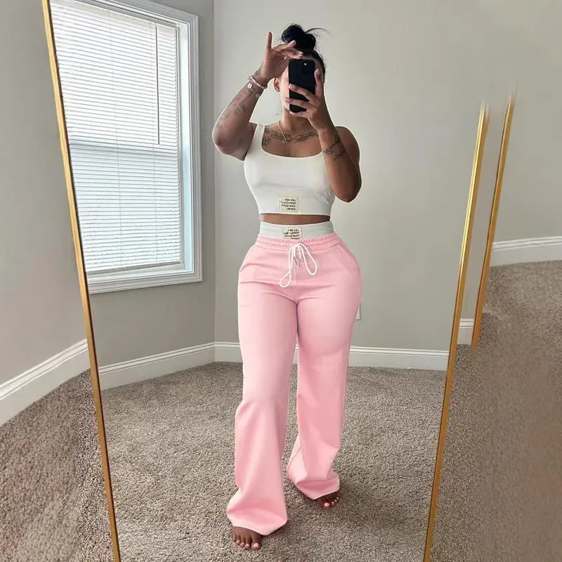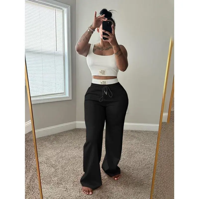 New Drop! European - American Style Cross - border Trendy Color - Blocked Double - Waistband Layered Loose Street - style Athletic Casual Trousers Two - Piece Set for Women