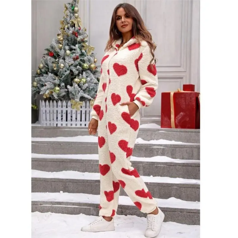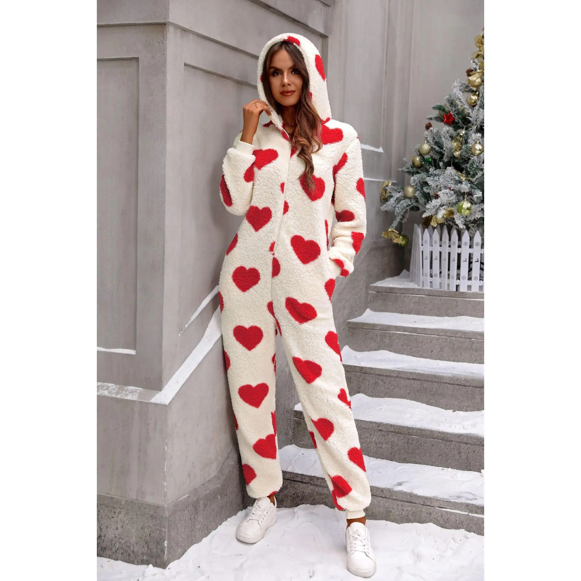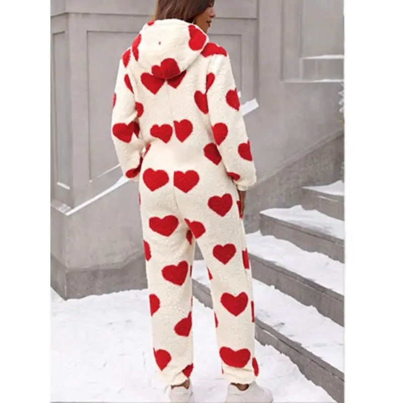 Women's Christmas Jumpsuit Plush Pajamas Fashion Heart Print Long Sleeve Fall Winter Hooded Jumpsuits Warm Loungewear Outfit