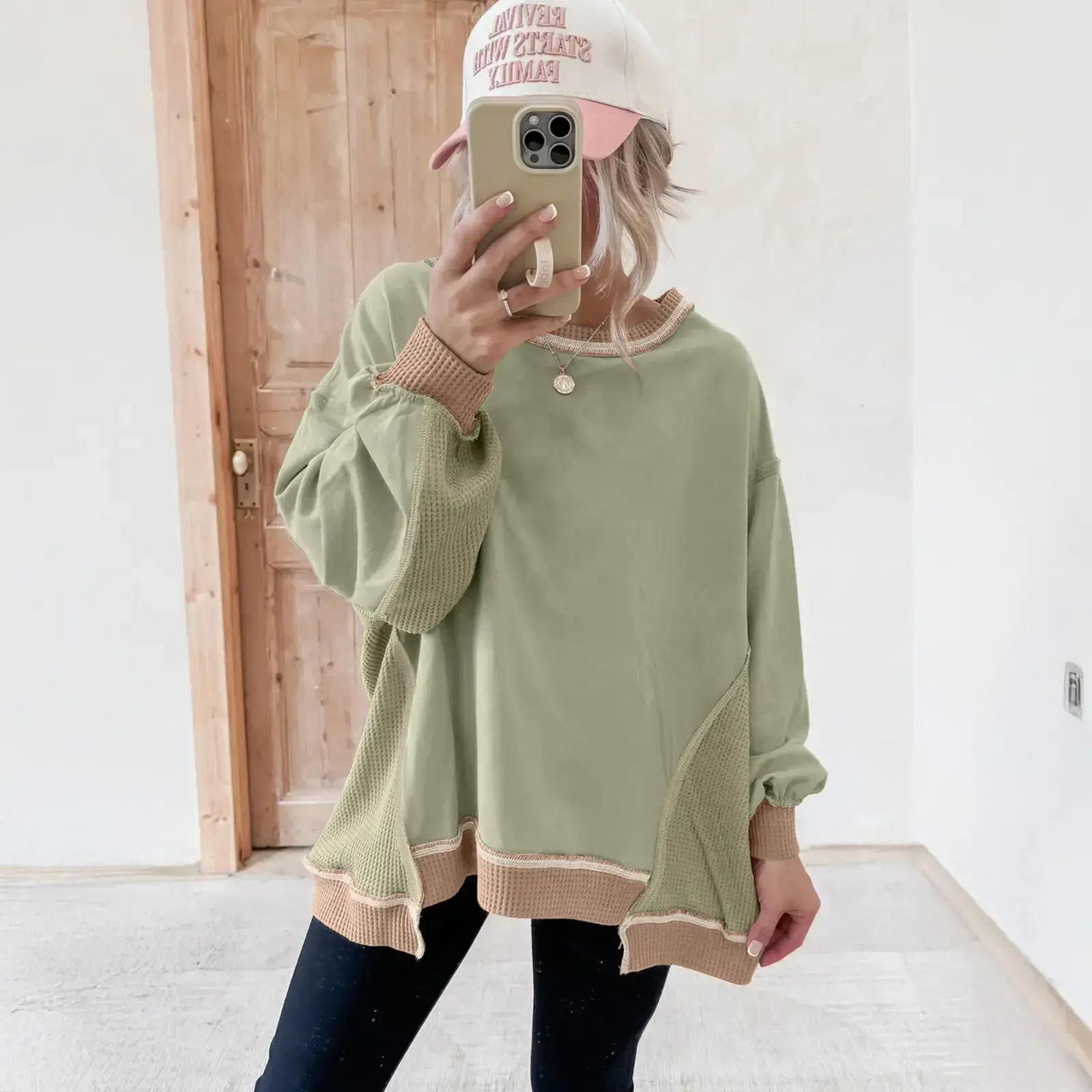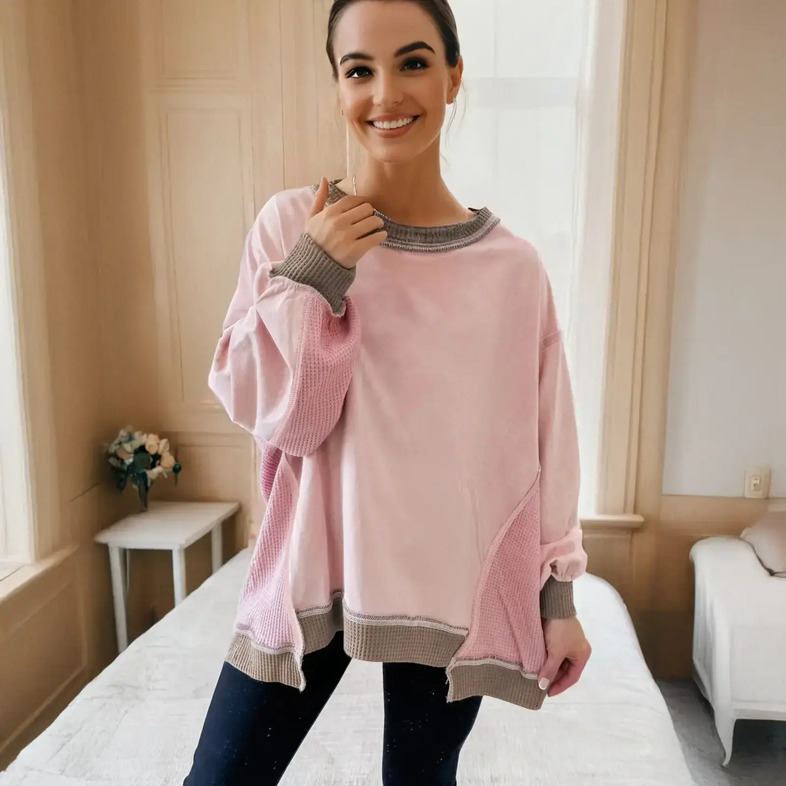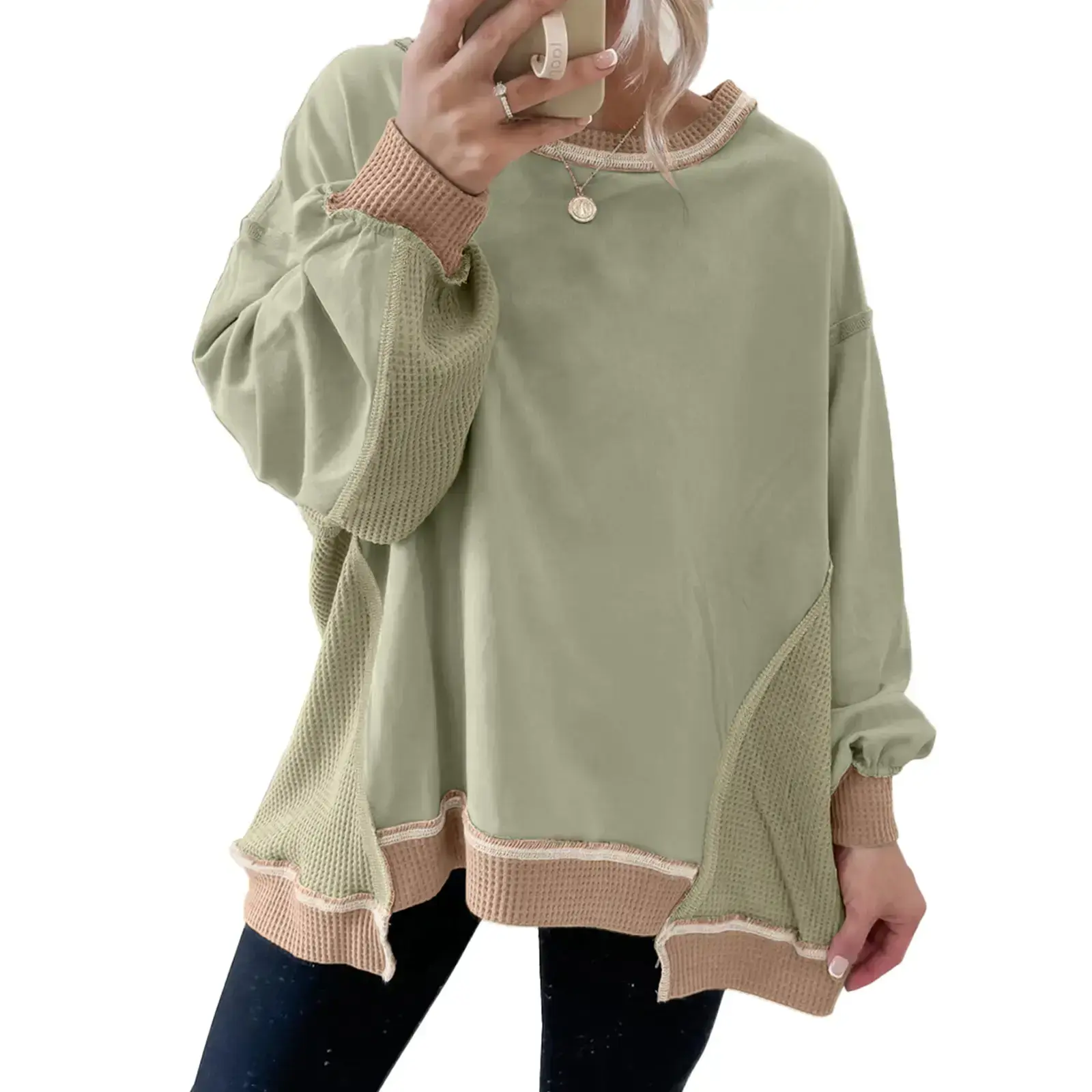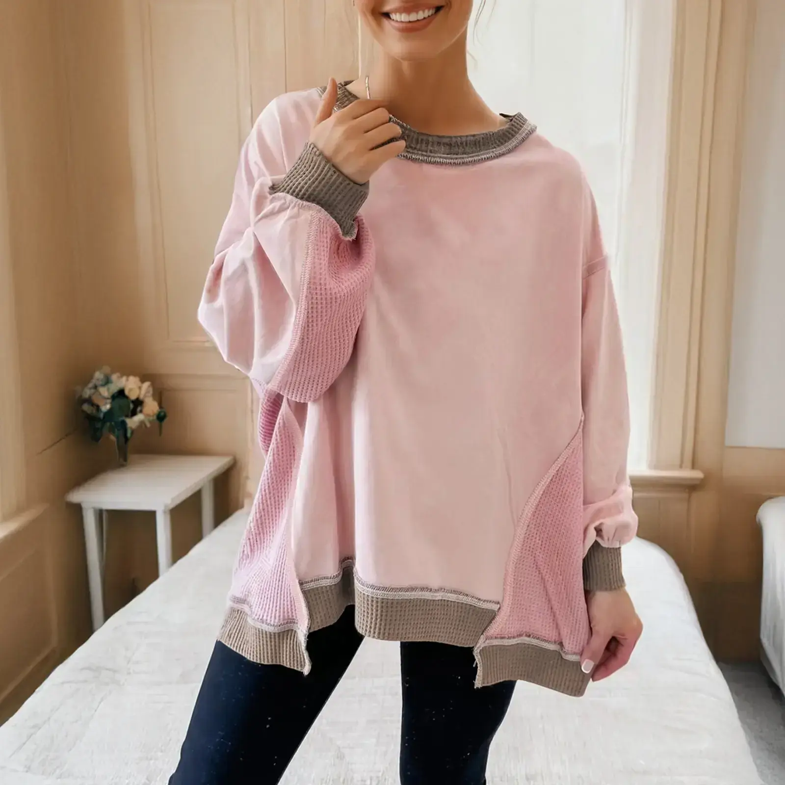 Color Block Mix Texture Waffle Patchwork Oversize Sweatshirt Full Size Range Available in Size S-4X Both for Plus Size & Regular
