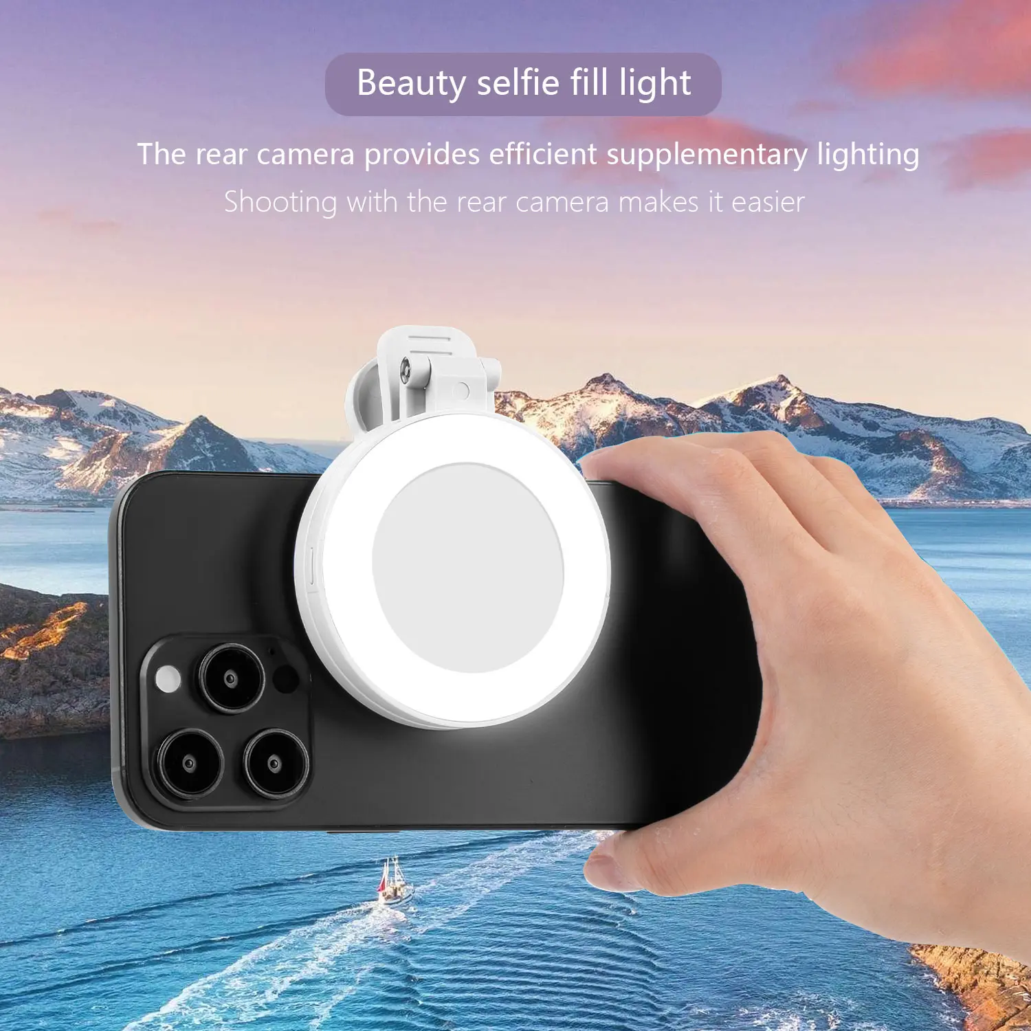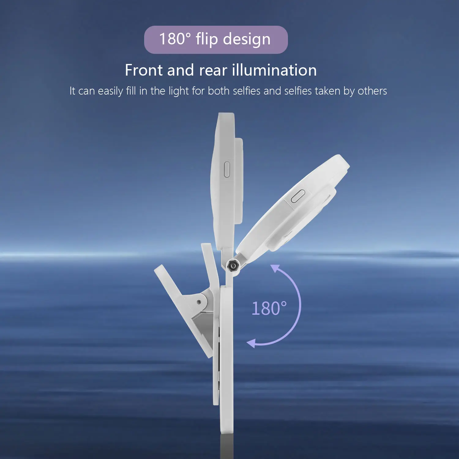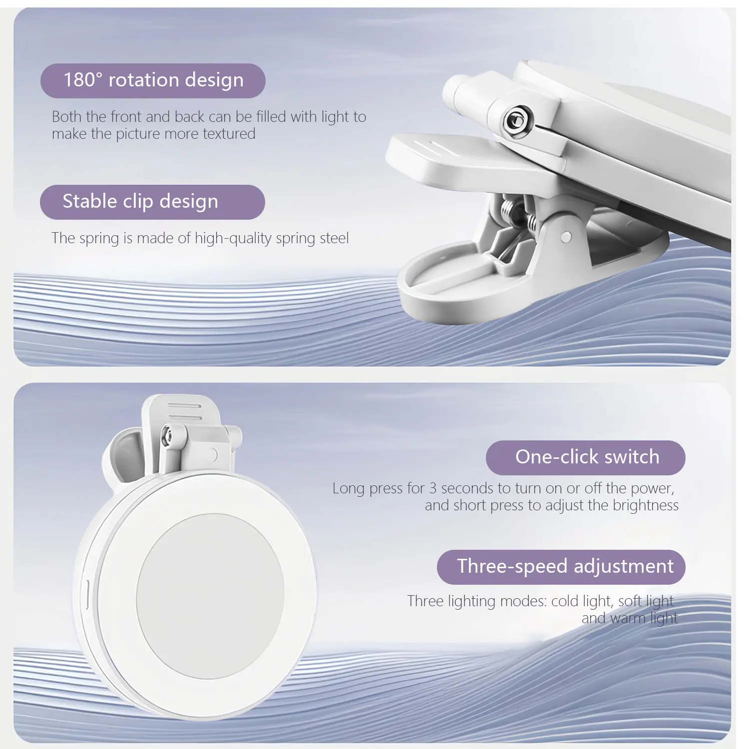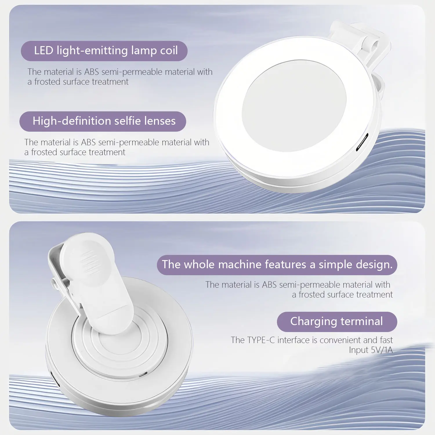 360° LED Ring Light with Mirror & Phone Holder 3-in-1 Rechargeable Makeup Light for Live Streaming, Video Calls, Selfie Features: 360° Circular Fill Light: Integrated for high-definition makeup and adjustable phone holder. Adjustable Phone Holder: Meets the needs of multiple scenarios such as makeup, live streaming, and video calls. Three Adjustable Color Temperatures: 2700K warm, 5600K natural, 7500K cold. Stepless Brightness Control: 10-100% brightness control for enhanced skin tone and eye brightness. 360° Rotating Circular Lamp: Easily switch between selfie mode and ambient lighting. Built-in Makeup Mirror: 56mm high-definition mirror for quick makeup adjustments. Compact and Durable Battery: 60mm diameter, 80g weight, 500mAh rechargeable battery for up to 45 minutes of maximum brightness or 500 minutes at the lowest setting. Perfect for: Content creators Video bloggers Photographers Seeking dynamic lighting options Specifications: Color Temperatures: 2700K, 5600K, 7500K Brightness Control: 10-100% Battery: 500mAh, up to 45 minutes of maximum brightness or 500 minutes at the lowest setting Weight: 80g Diameter: 60mm Usage: Ideal for makeup, live streaming, video calls, and beauty tutorials. Portable and easy to carry in a pocket or bag. Conclusion: The 360° LED Ring Light with Mirror & Phone Holder is a versatile and portable lighting solution for various occasions, offering adjustable color temperatures and brightness control for professional-quality lighting.