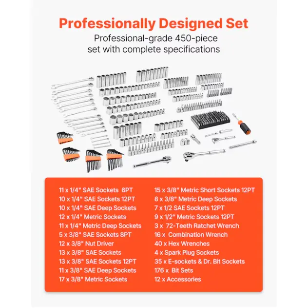 Mechanics Tool Set and Socket Set, 450 Pcs, 1/4, 3/8 and 1/2 inch Drive Deep and Standard Sockets, SAE Metric Mechanic Tool Kit with Bits, Wrenches, Accessories, Storage Case with Orange Drawer