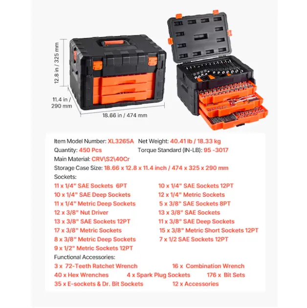 Specification: Item Model Number: XL3265A; Quantity: 450 Pcs; Storage Case Size: 17.91 x 12.8 x 11.4 inch / 455 x 325 x 290 mm; Net Weight: 40.41 lbs / 18.33 kg; Main Material: CR-V, 40Cr; Torque Standard: 95-3017 in-lb