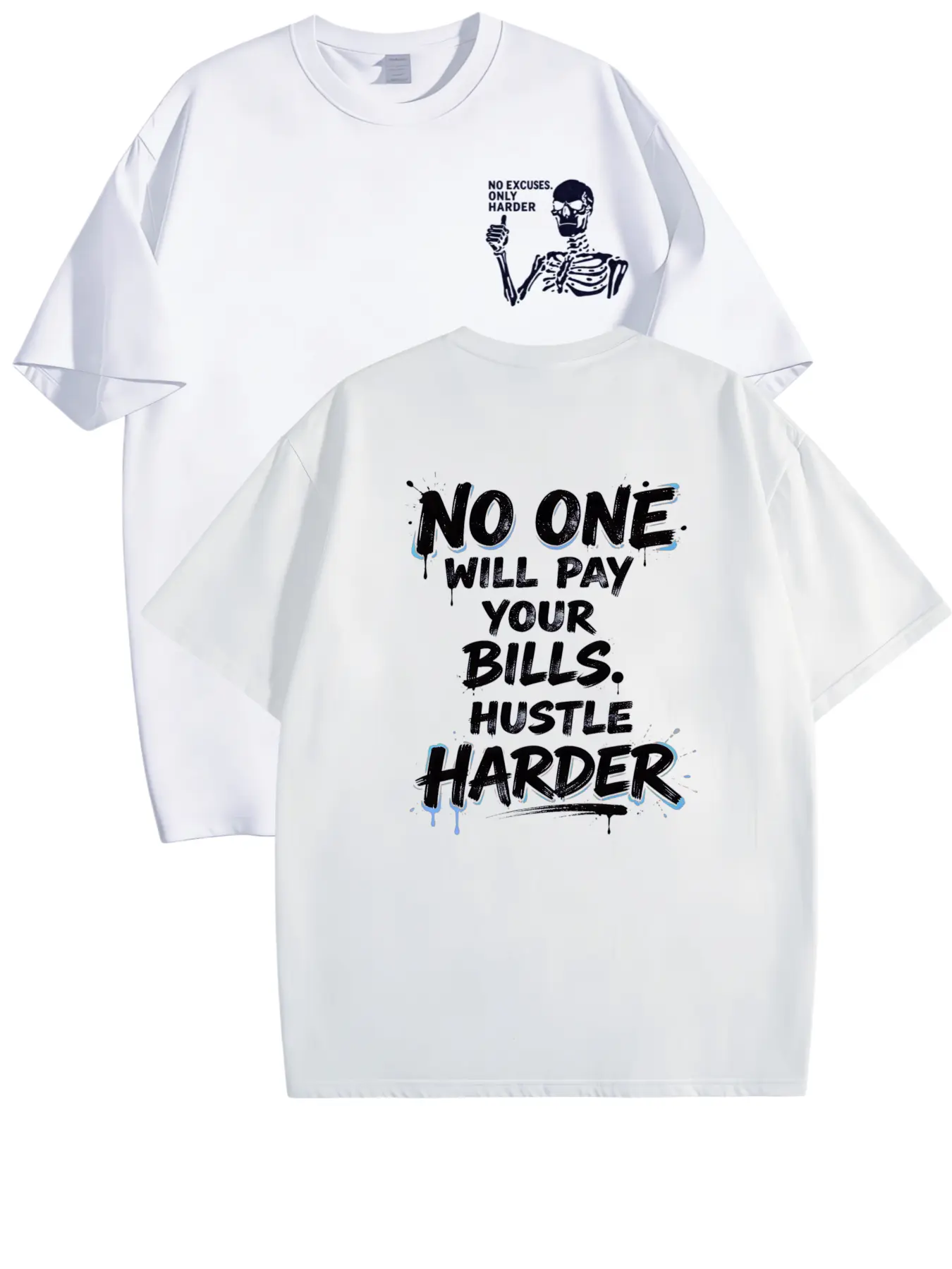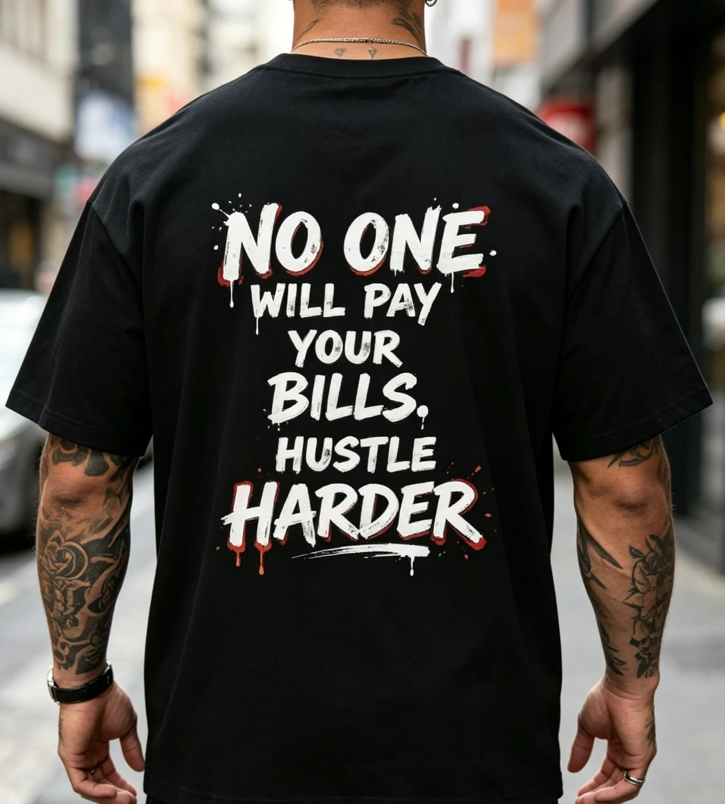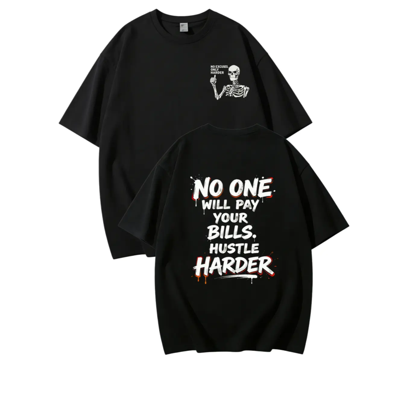 ·Back Oversized Graffiti Drip Motivational Print: A massive, high-impact brushstroke font design in bold red and white contrast, with raw paint drip and splatter details, screaming the iconic mantra: NO ONE WILL PAY YOUR BILLS, HUSTLE HARDER. The street-style graffiti drip effect isn’t just for looks — it’s the visual embodiment of your late nights grinding, your sweat poured into your goals, the blood, sweat and tears you put in to build a better life. This isn’t soft, coddling motivational fluff. It’s the unvarnished adult truth, printed loud and proud on your back, to keep you accountable every time you look in the mirror, every time you feel like quitting.