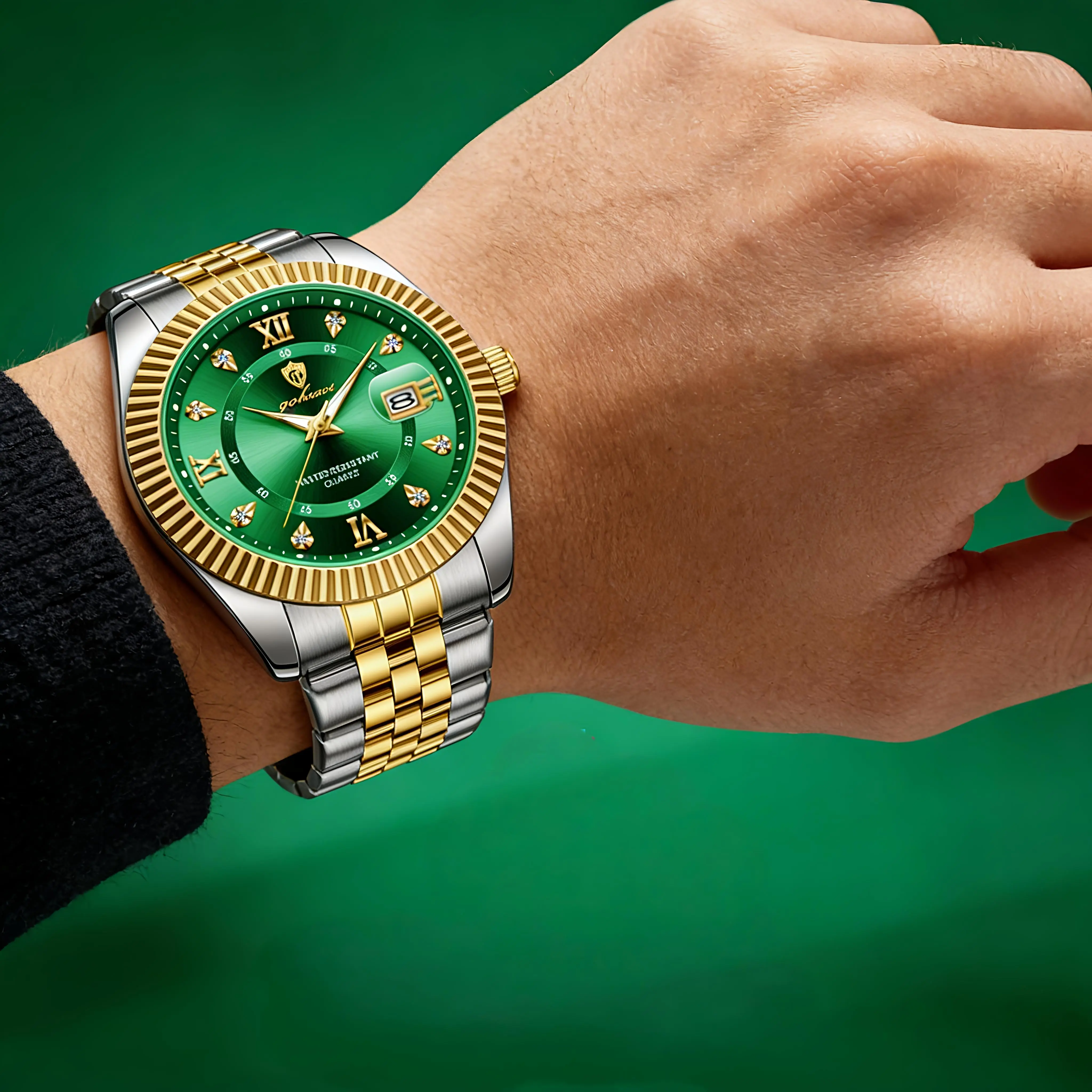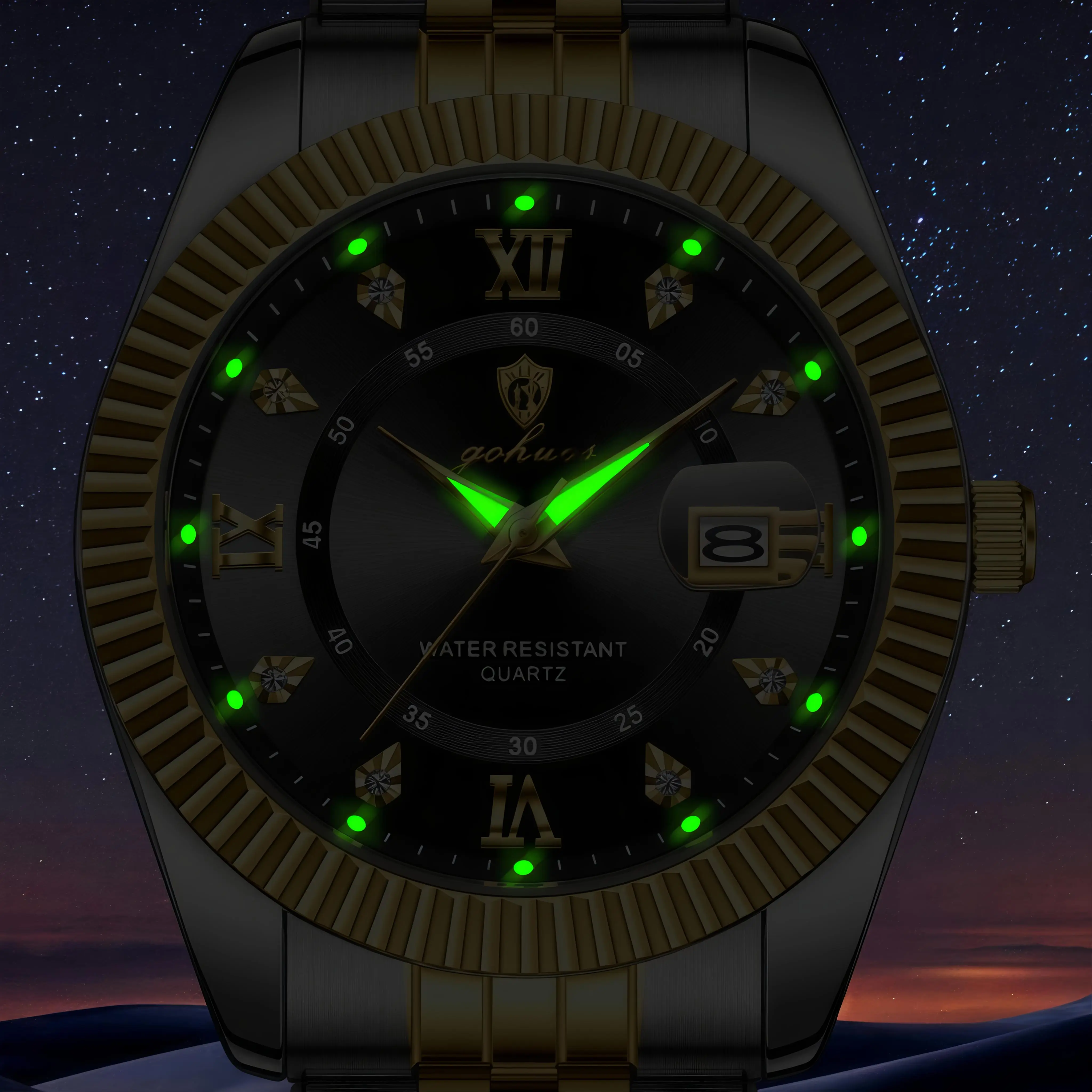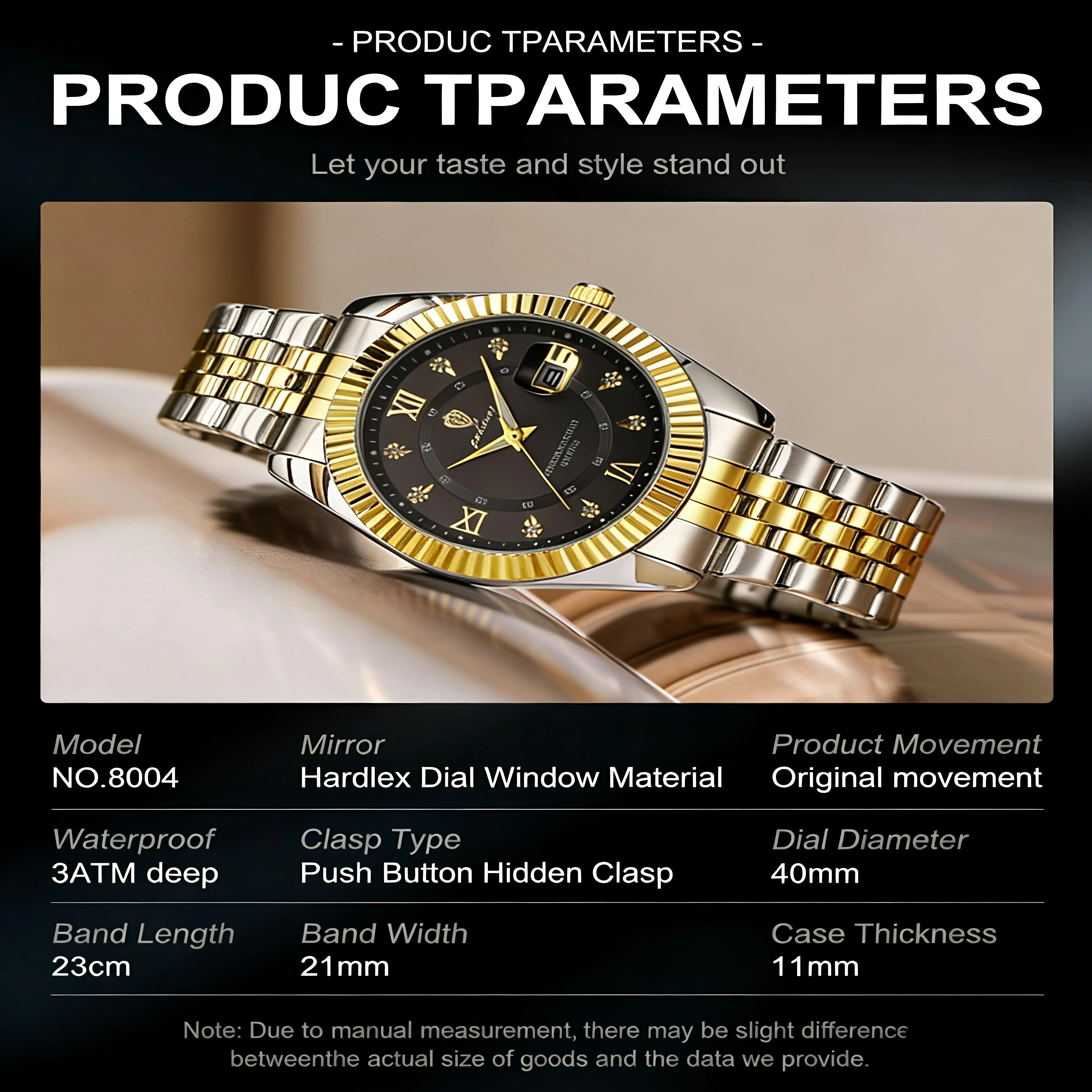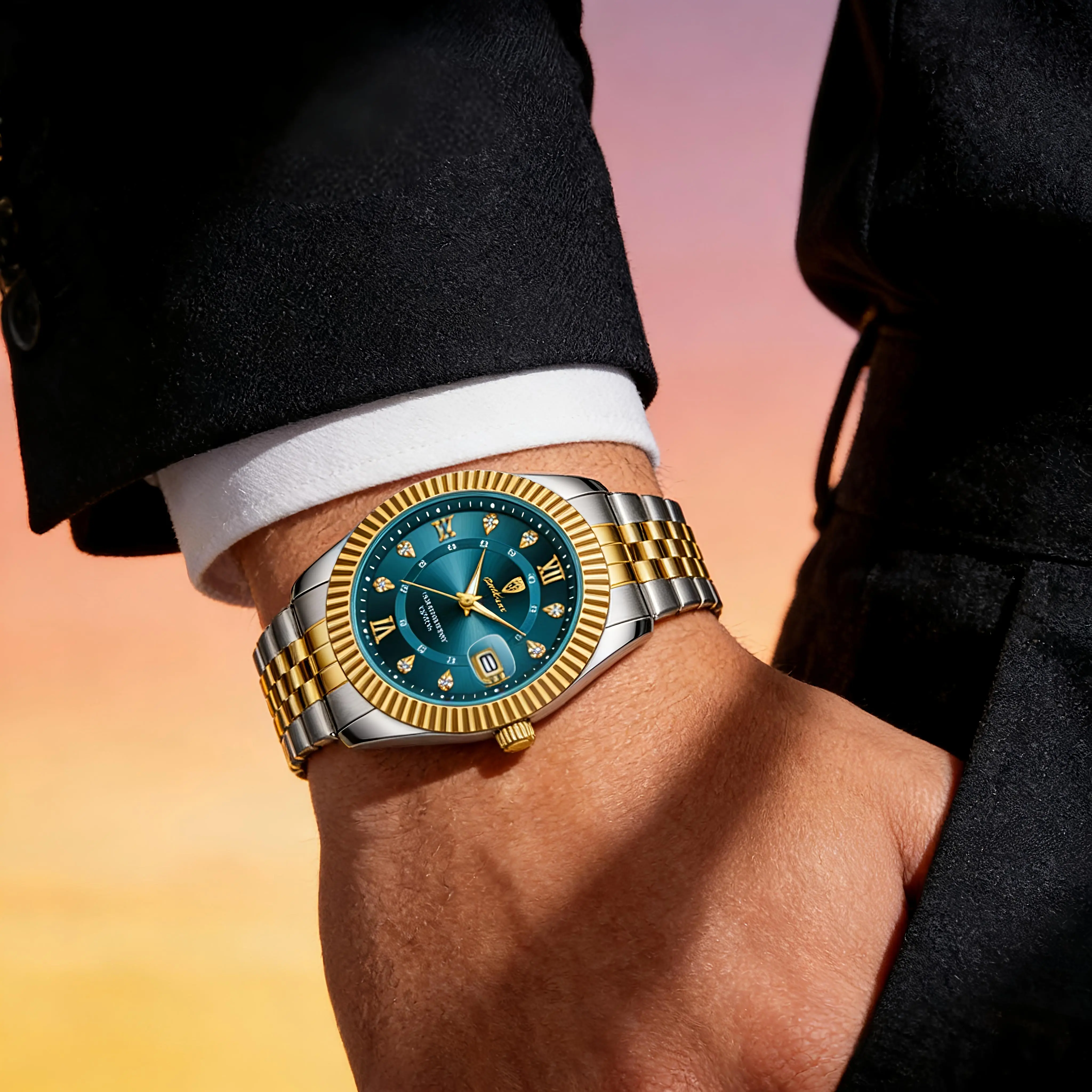 Elegant Design- Log-Style Design: Timeless luxury with a serrated rotating bezel and diamond-accented dial.- Roman Numerals: Sophisticated, masculine vibe for business meetings, date nights, and everyday wear.