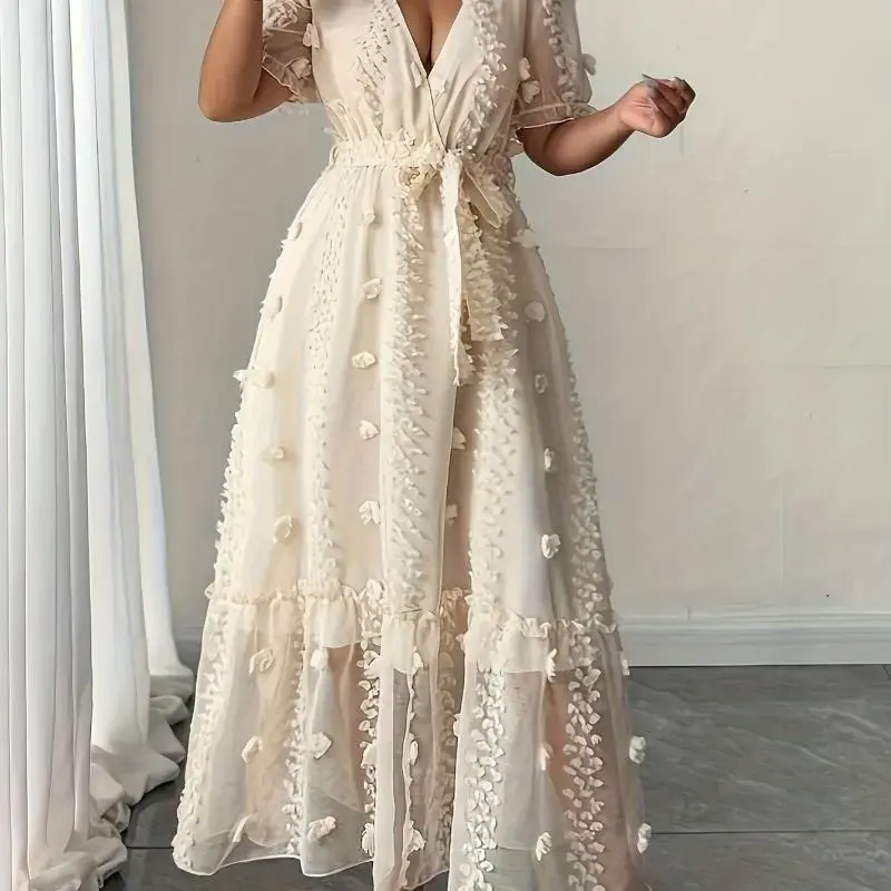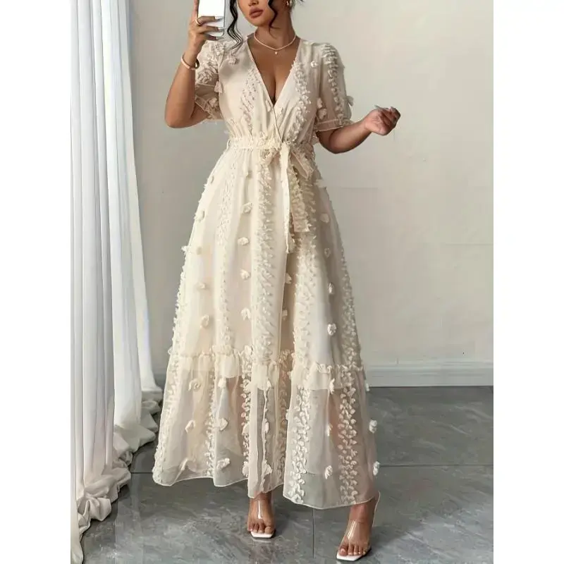 Women'SElegantV-NeckLongSleeveDresswithPuffSleevesandTieWaist-BeigeFloralLaceOverlay,A-LineSilhouette,PerfectforSpring/Summer/AutumnVacations,VacationAttire|FloralDress|PolyesterFabric��CasualFit