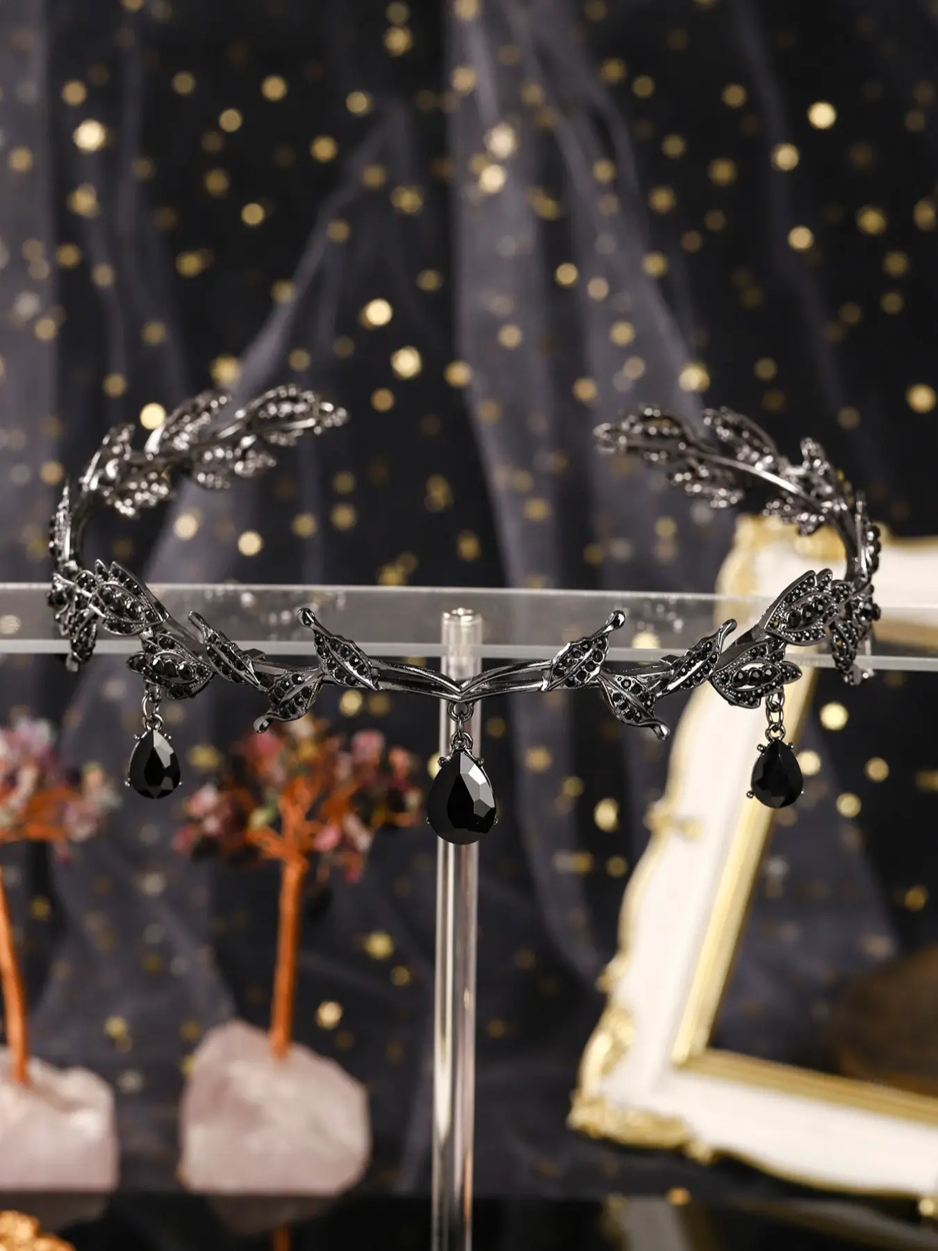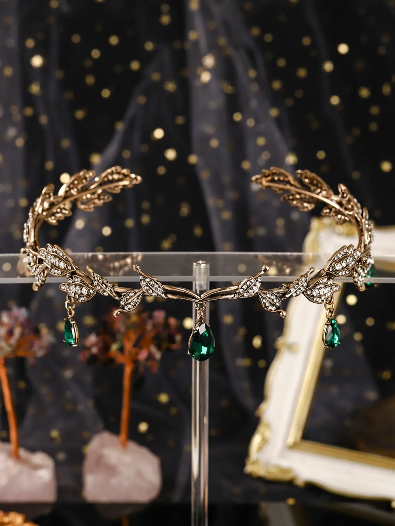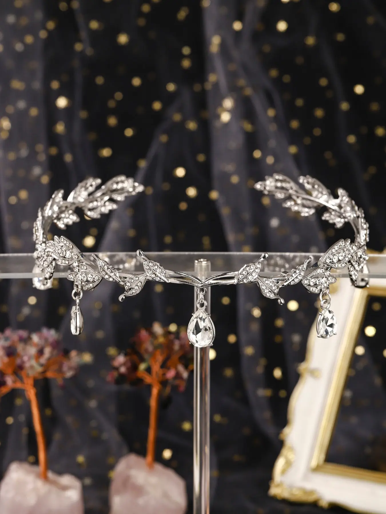 Vintage Creative Alloy Rhinestone Leaf Water Drop Pendant Headpiece Crown, Adjustable Bridal Party Accessory, Holiday Gift