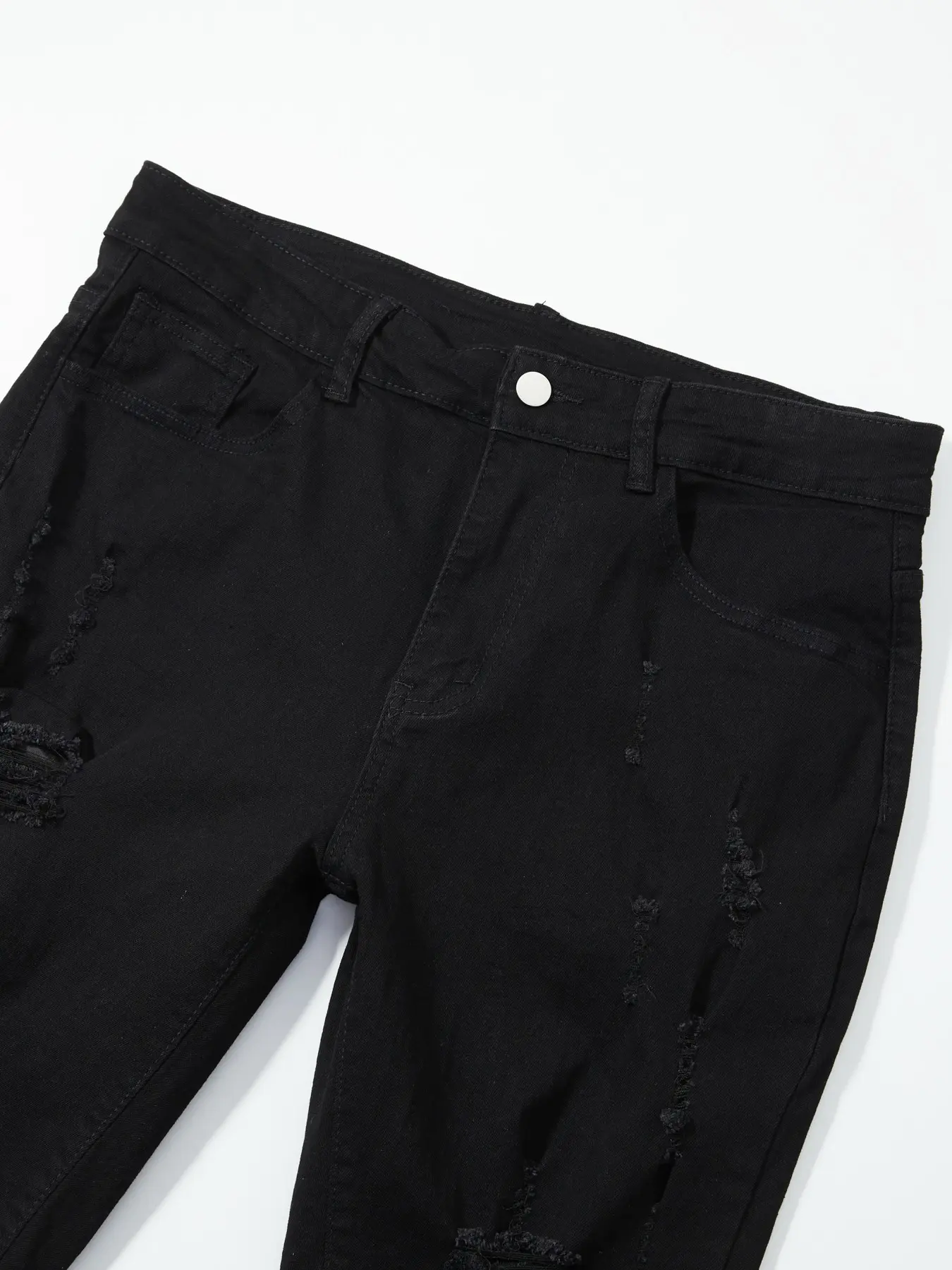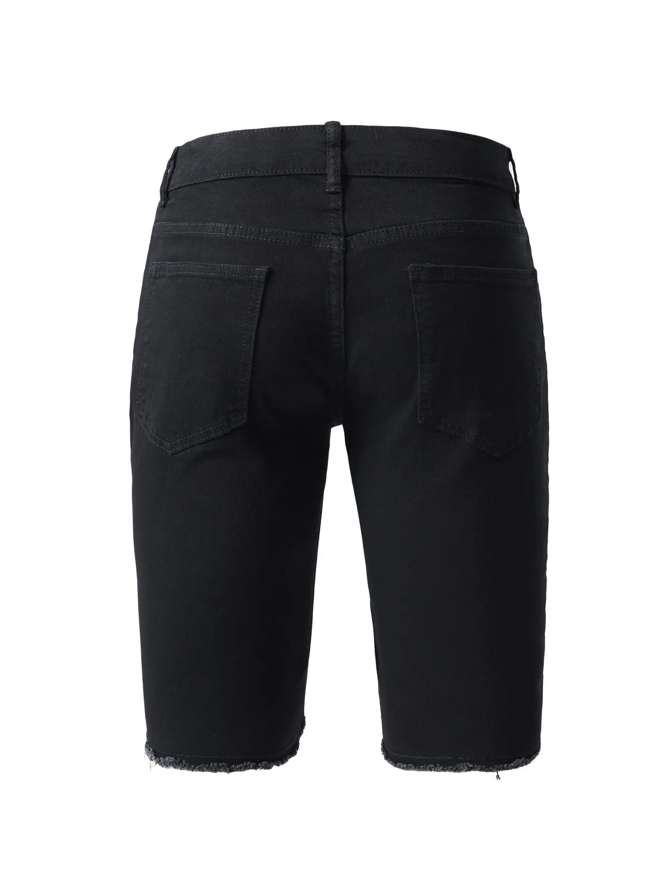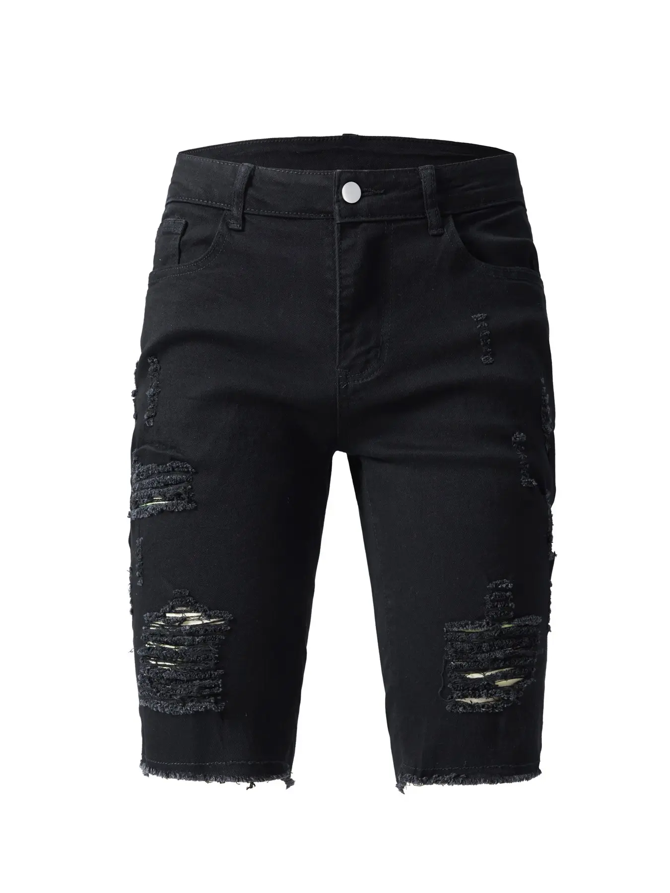 Men's Summer Washed Denim Shorts, Large Ripped Hem, Slim Fit Straight Leg, Streetwear Hip Hop Casual Five-Quarter Pants