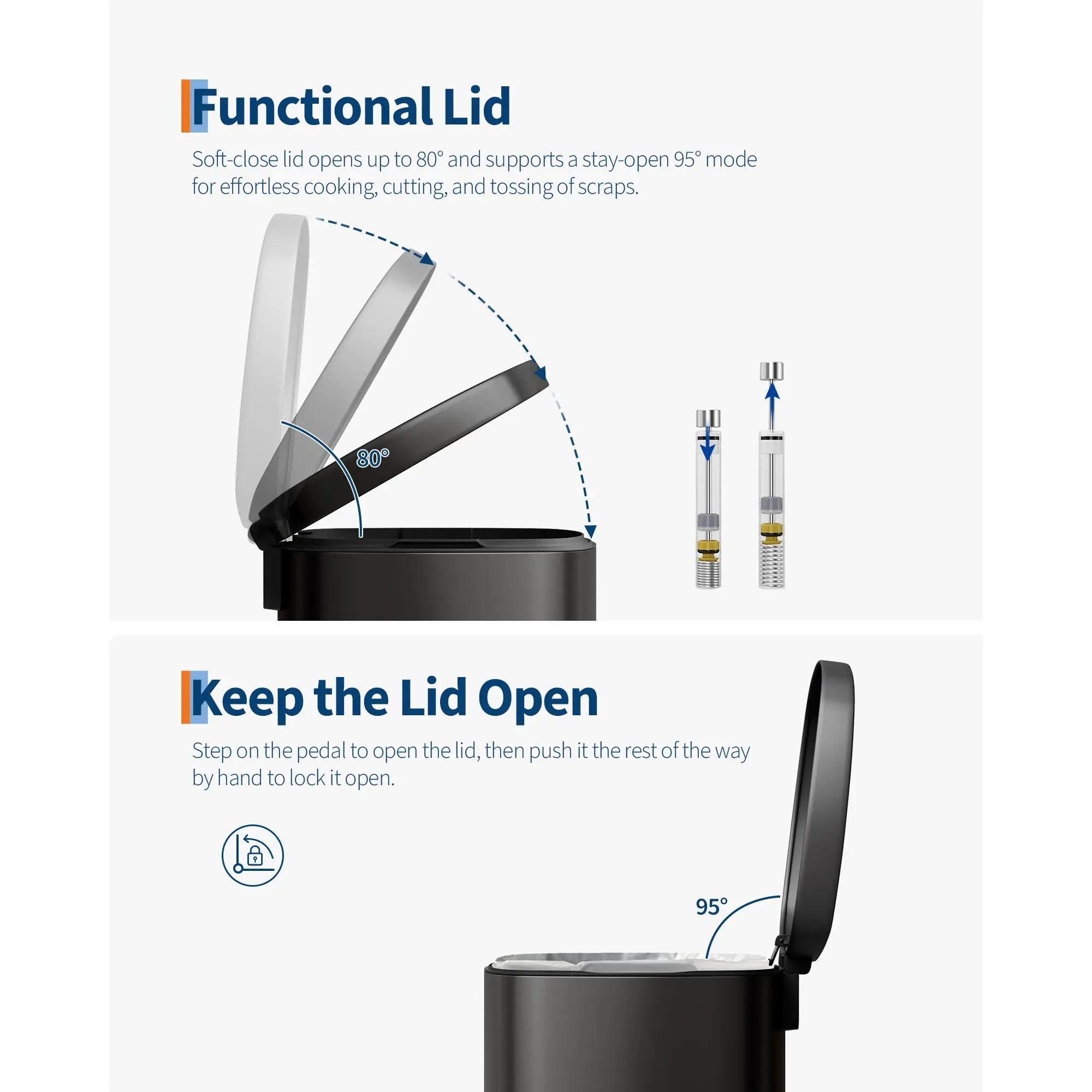 ·Removable inner bucket made from mark and odor-resistant polypropylene, featuring a custom liner ring to secure standard bags and prevent slipping or bunching