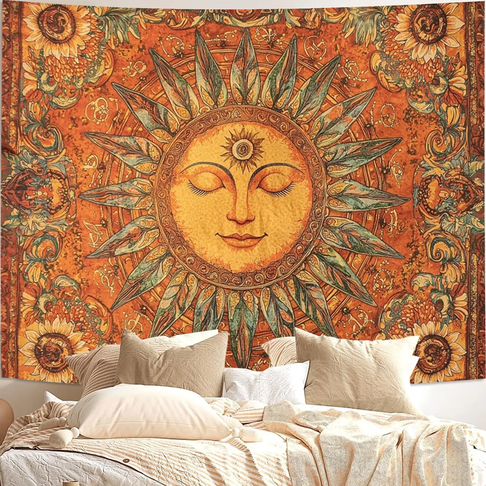 Vintage Bohemian Sun and Moon Tapestry | Closed-Eye Smiling Sun Wall Hanging, Aesthetic Boho Decor for Living Room Bedroom Dorm, Multi-Functional Indoor Outdoor Art
